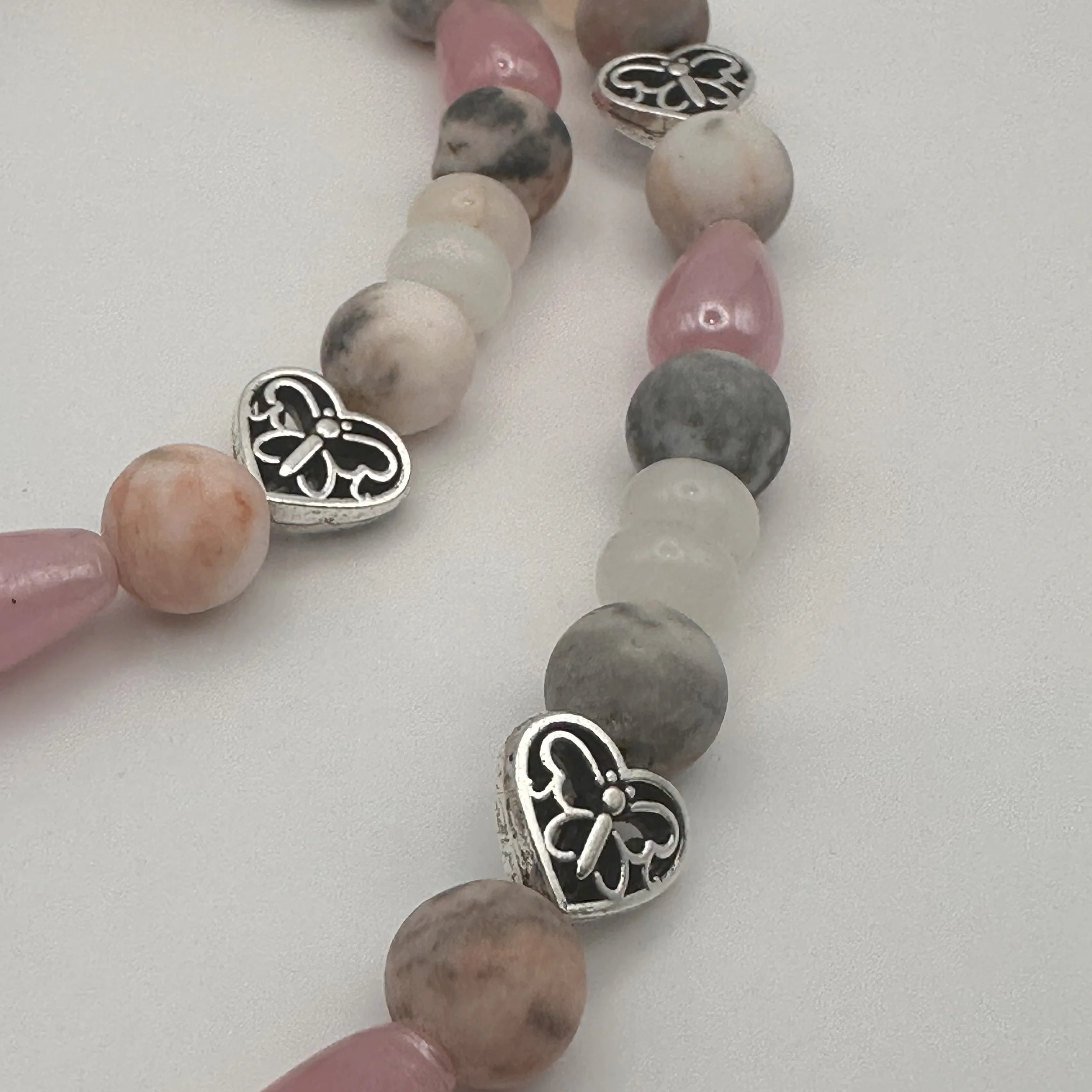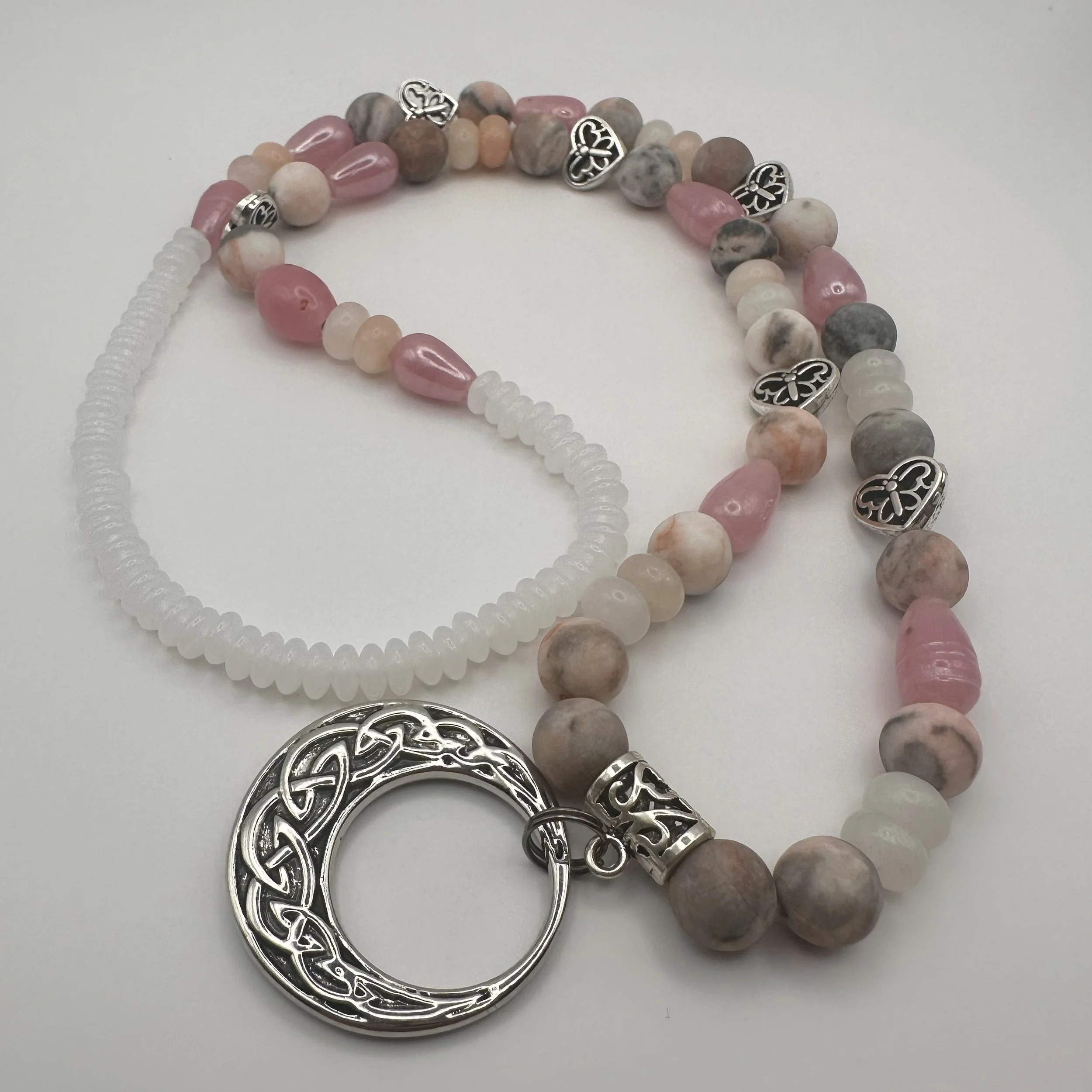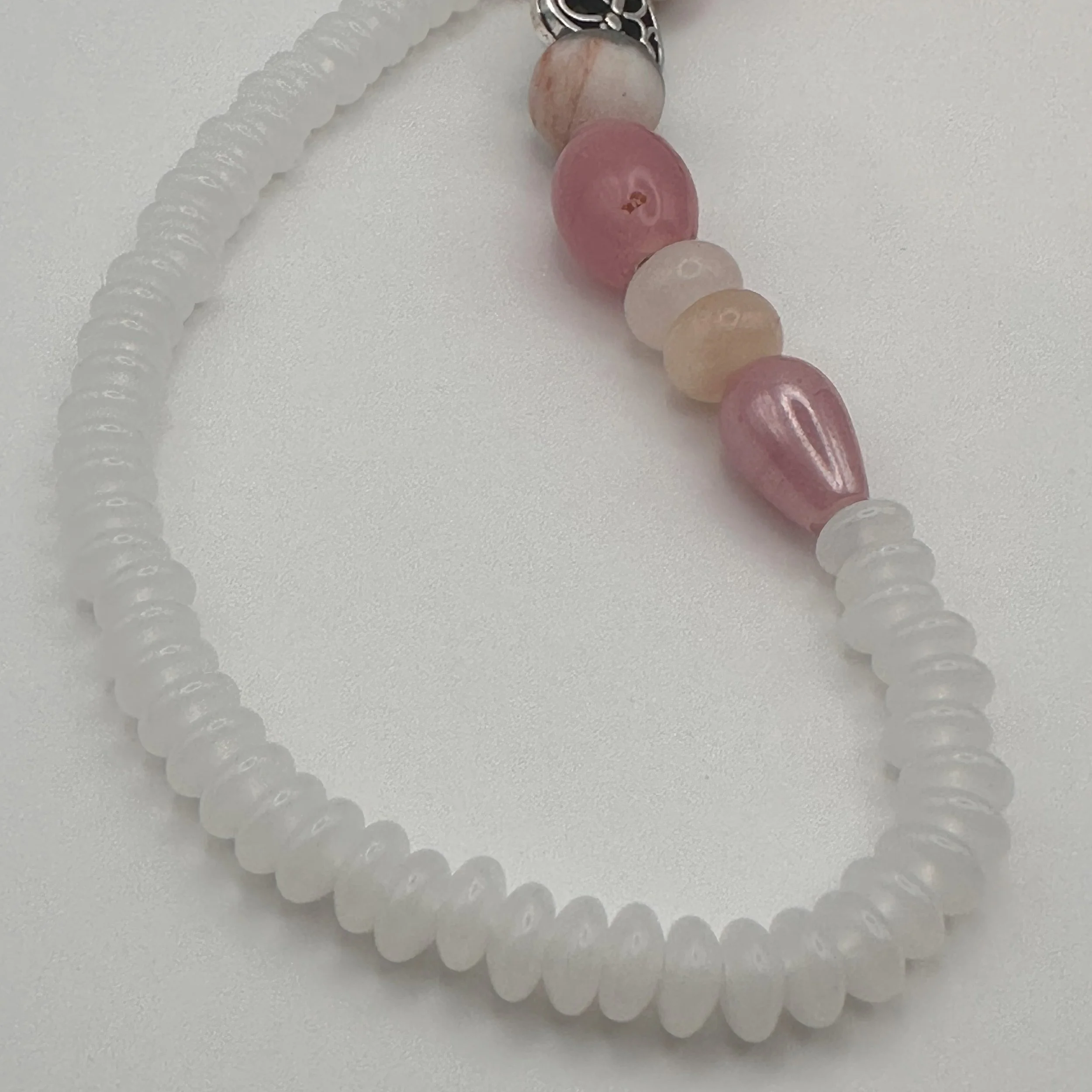 Easy going necklace made with pink earthy and white stone beads, pearl pink acrylic beads, with specialised silver fixtures and large silver pendant