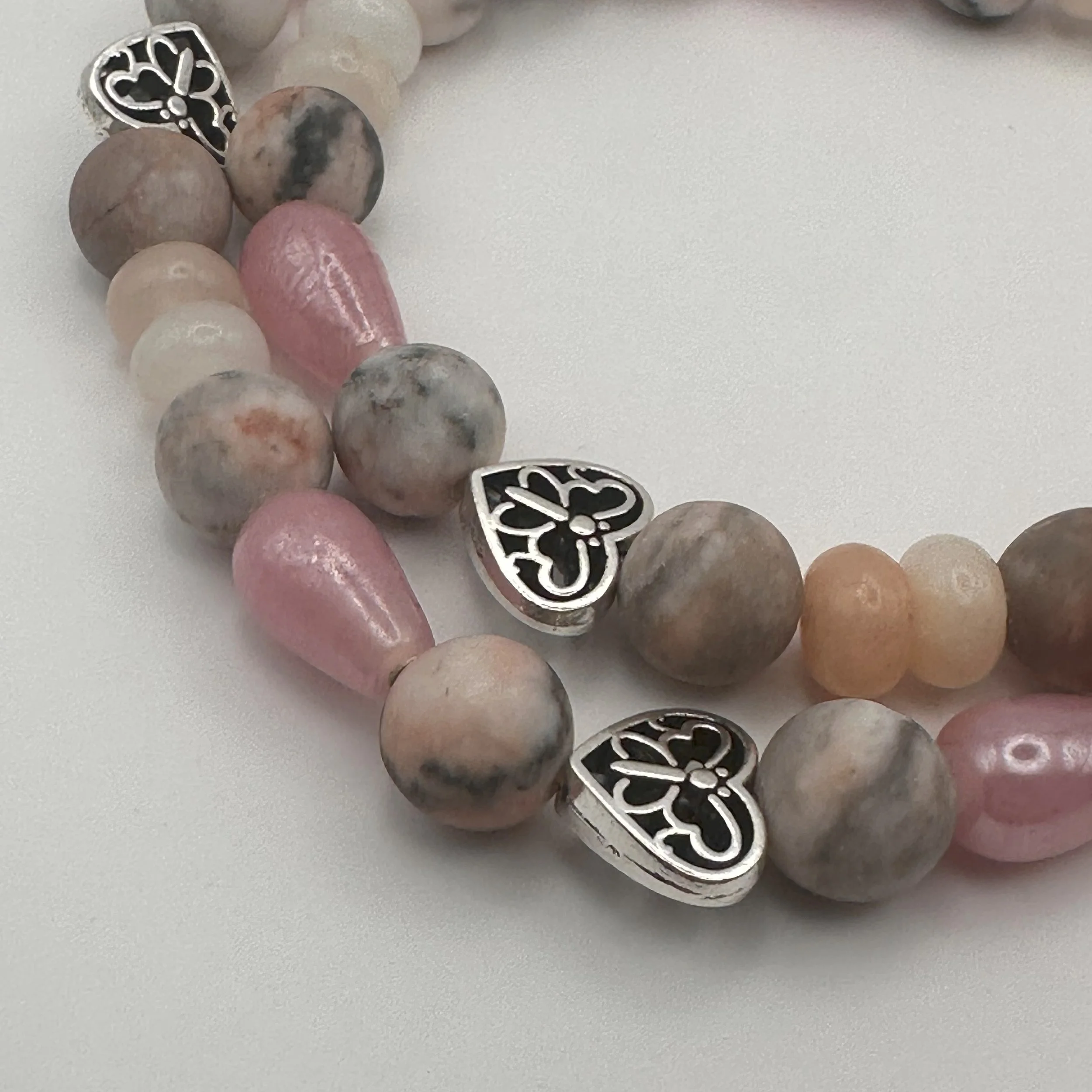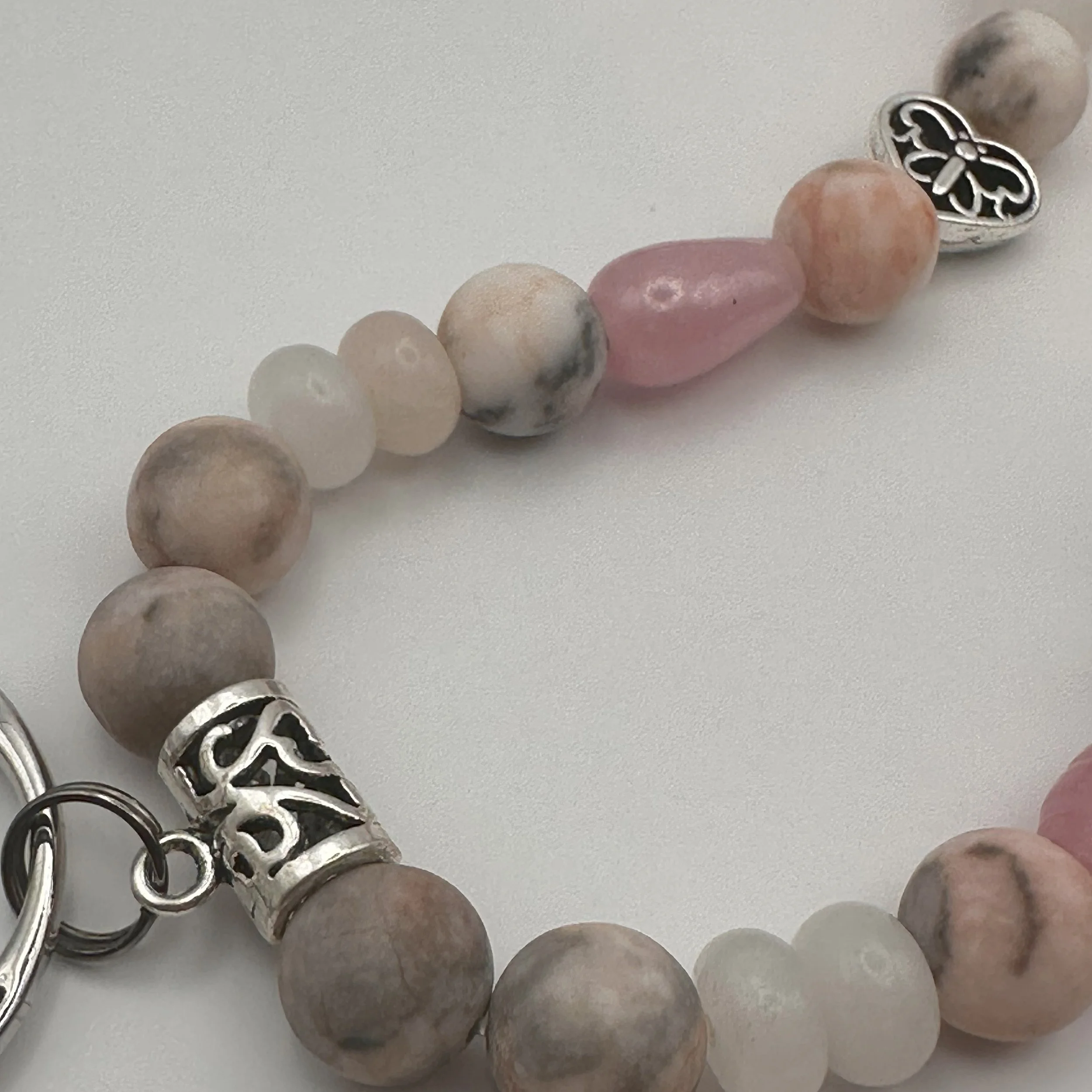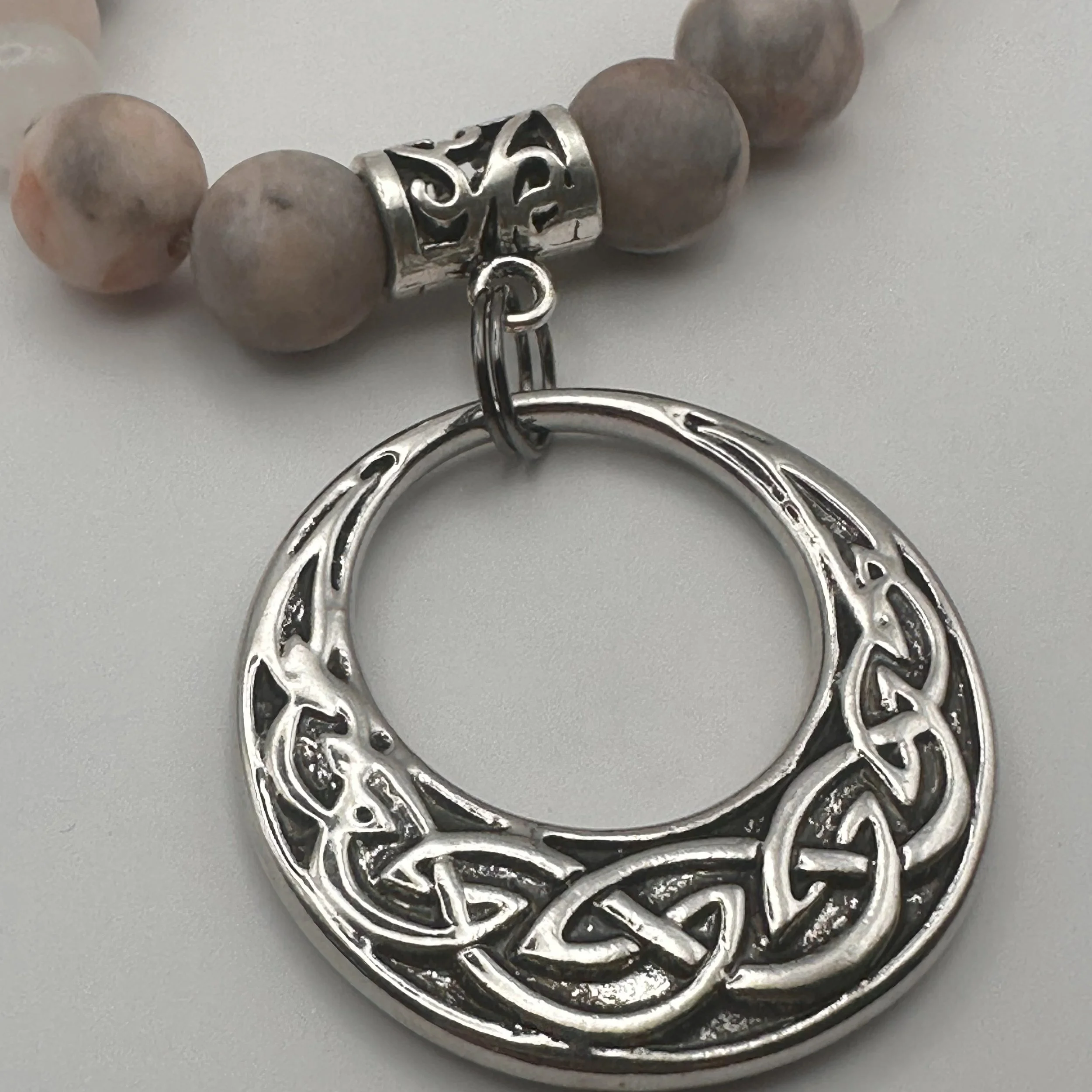 Easy going necklace made with pink earthy and white stone beads, pearl pink acrylic beads, with specialised silver fixtures and large silver pendant
