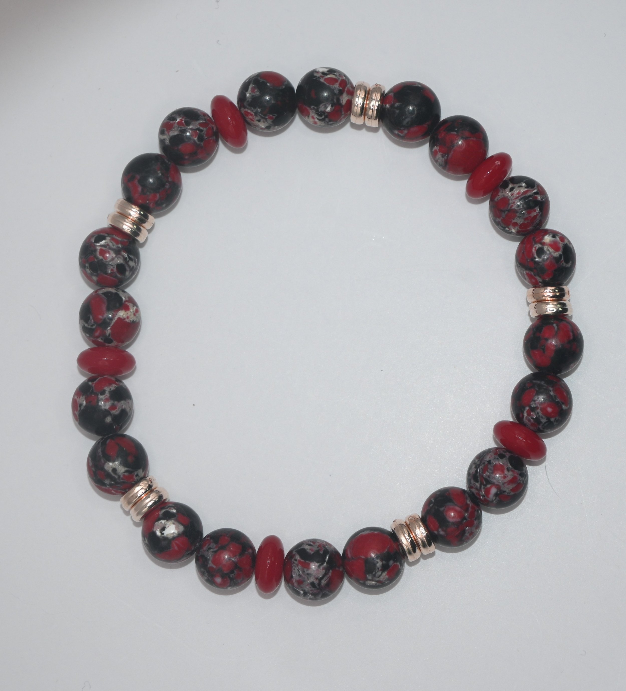 Elastic stretch bracelet with deep red natural stone beads with rose gold coated spacers with red acrylic spacers