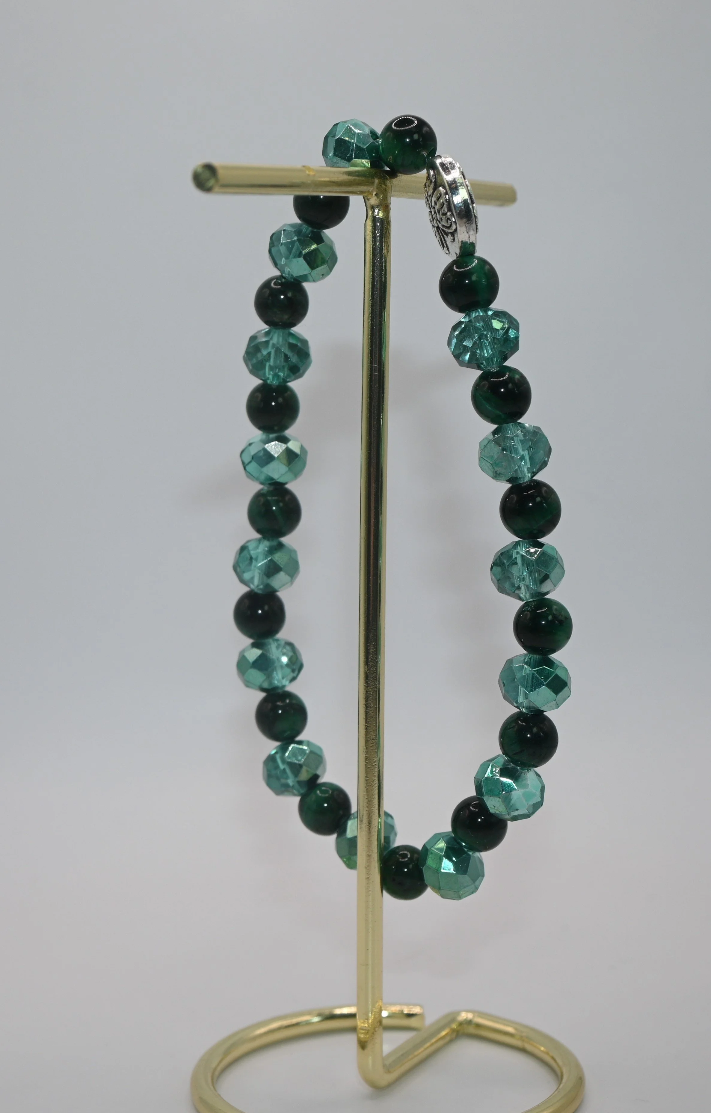 Elastic stretch bracelet with vibrant green tiger eye natural stone beads with green faceted rondelle beads with silver specialised butterfly spacer