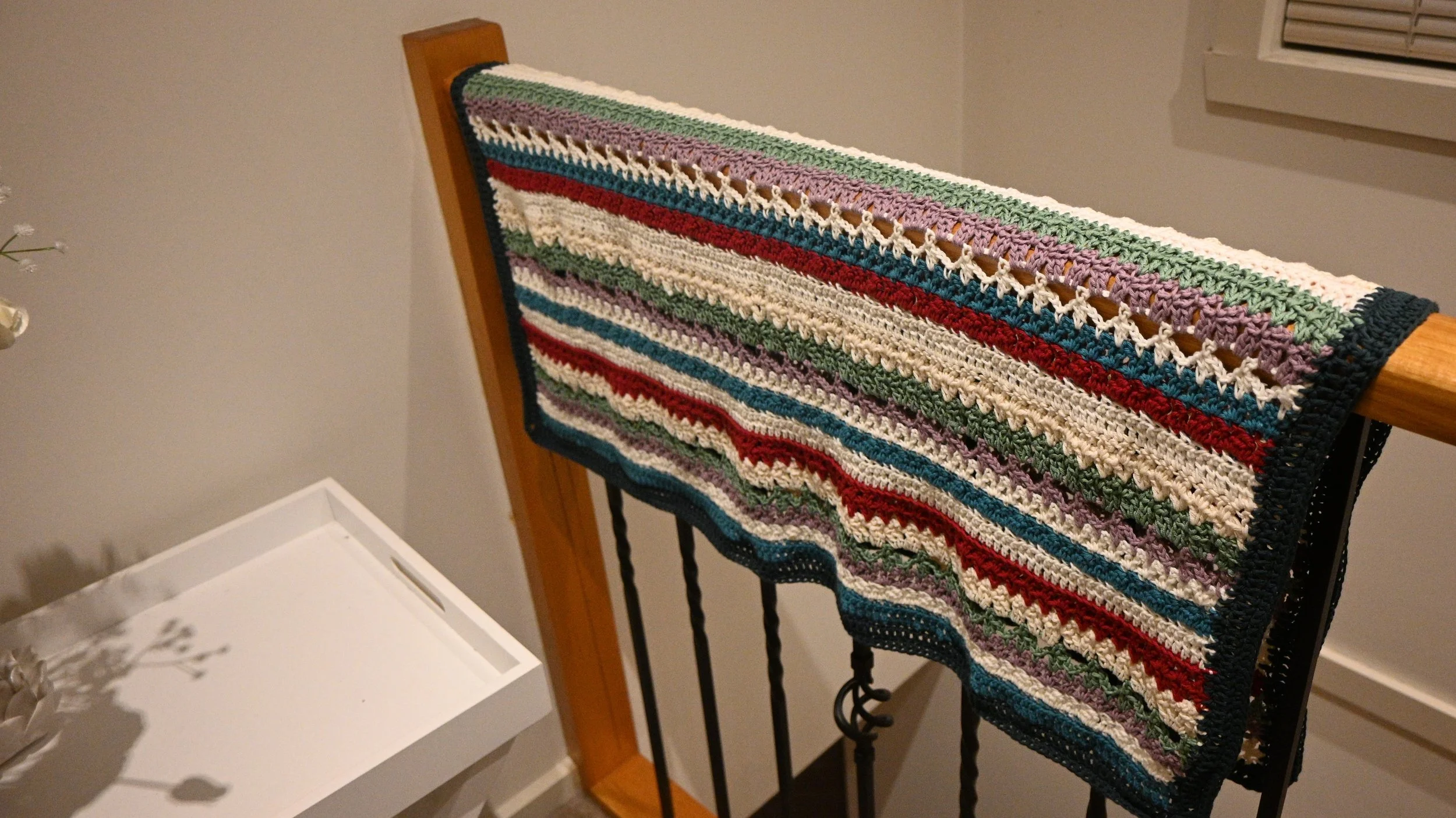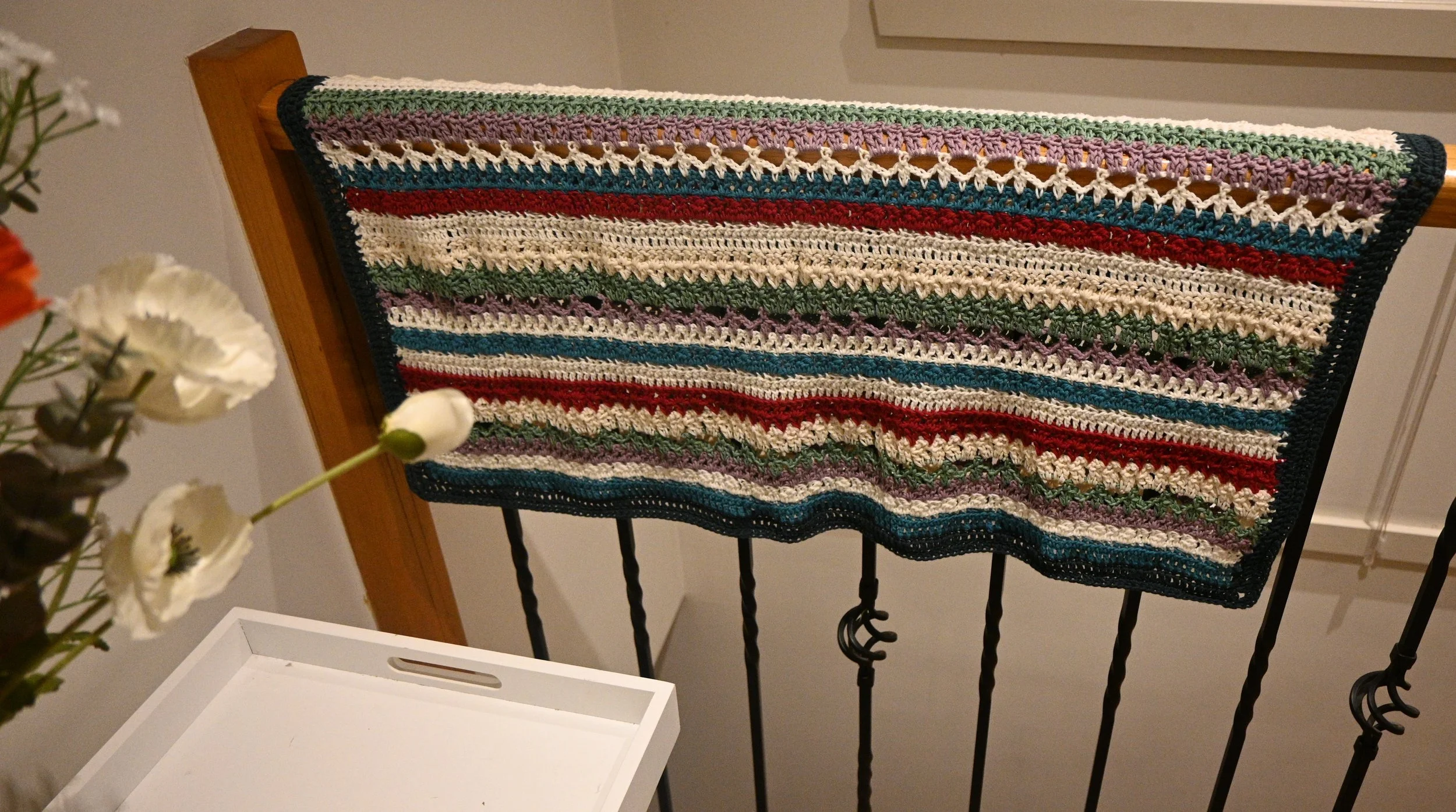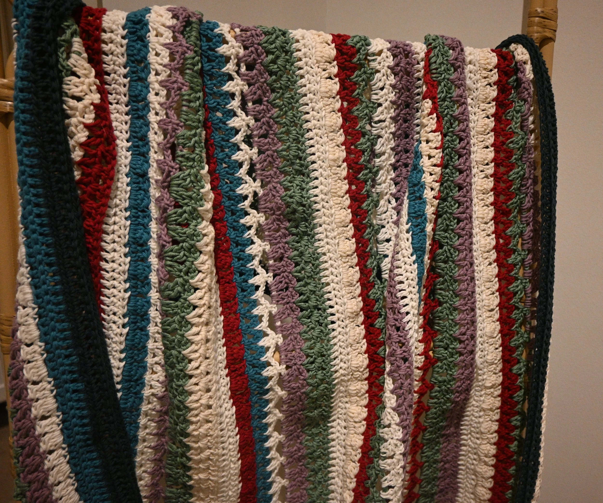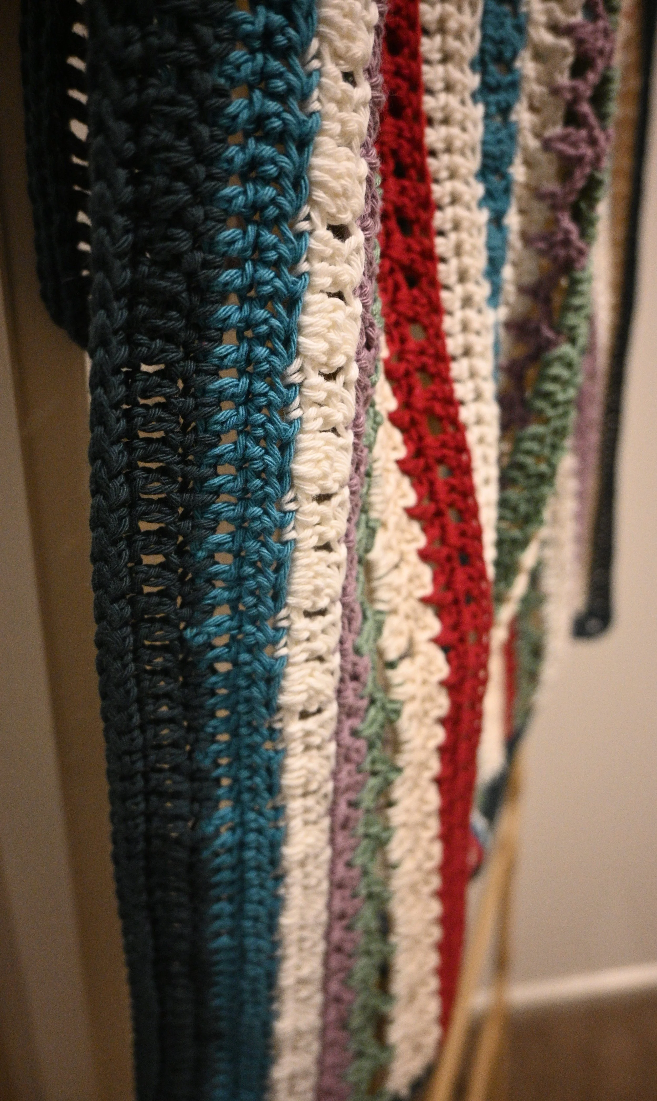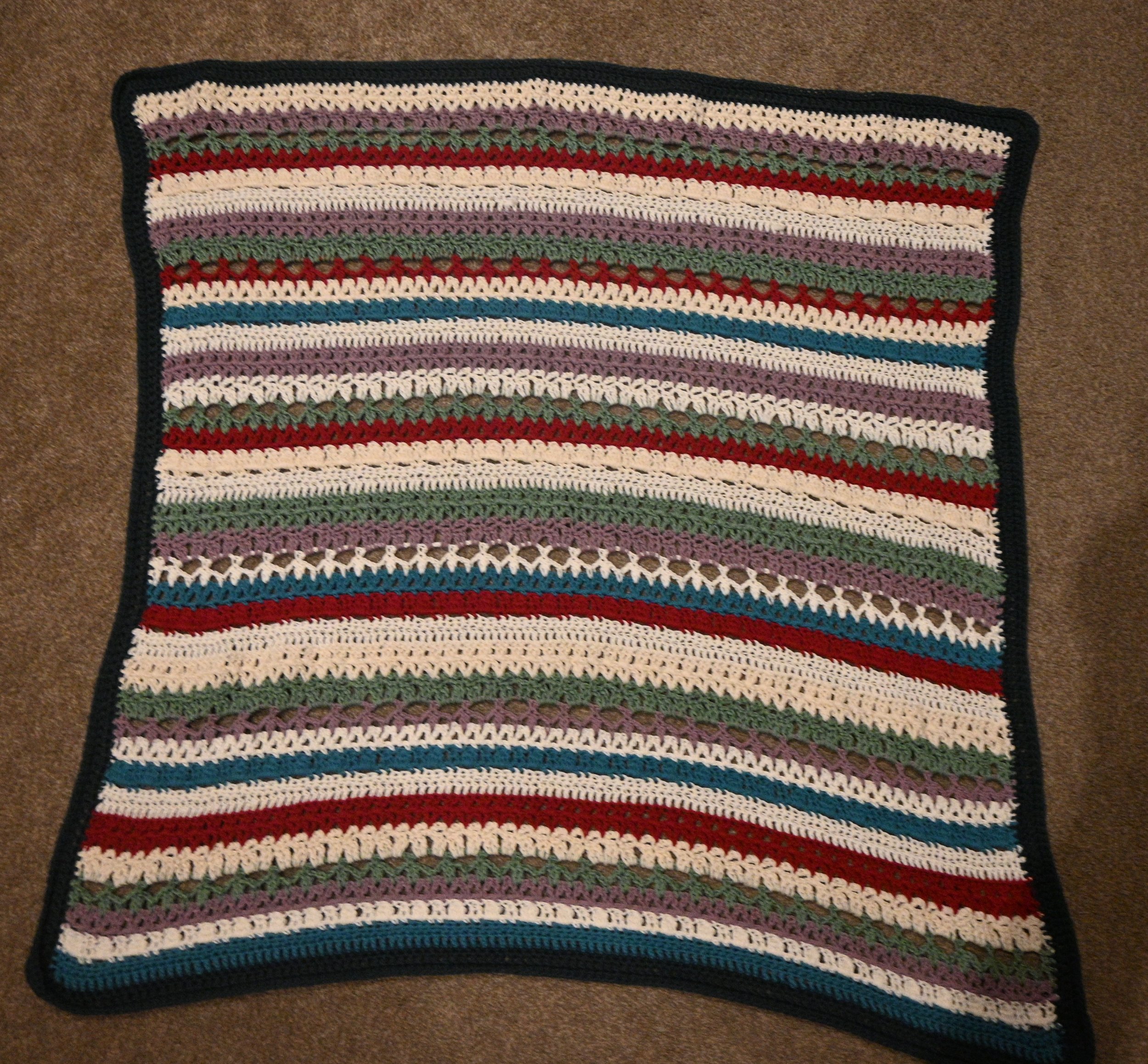 Cotton baby blanker with variety of stitches in stripes with bold colours.