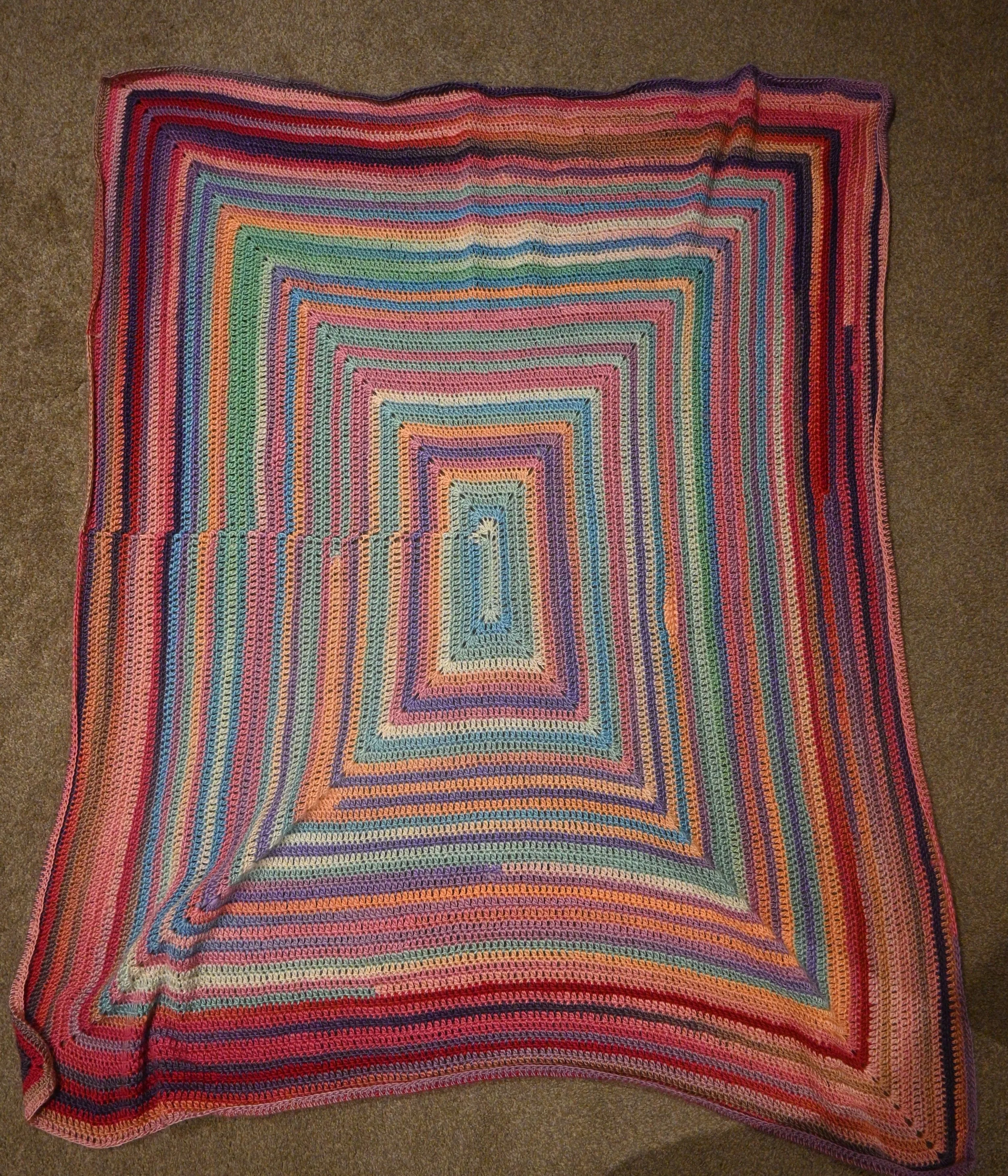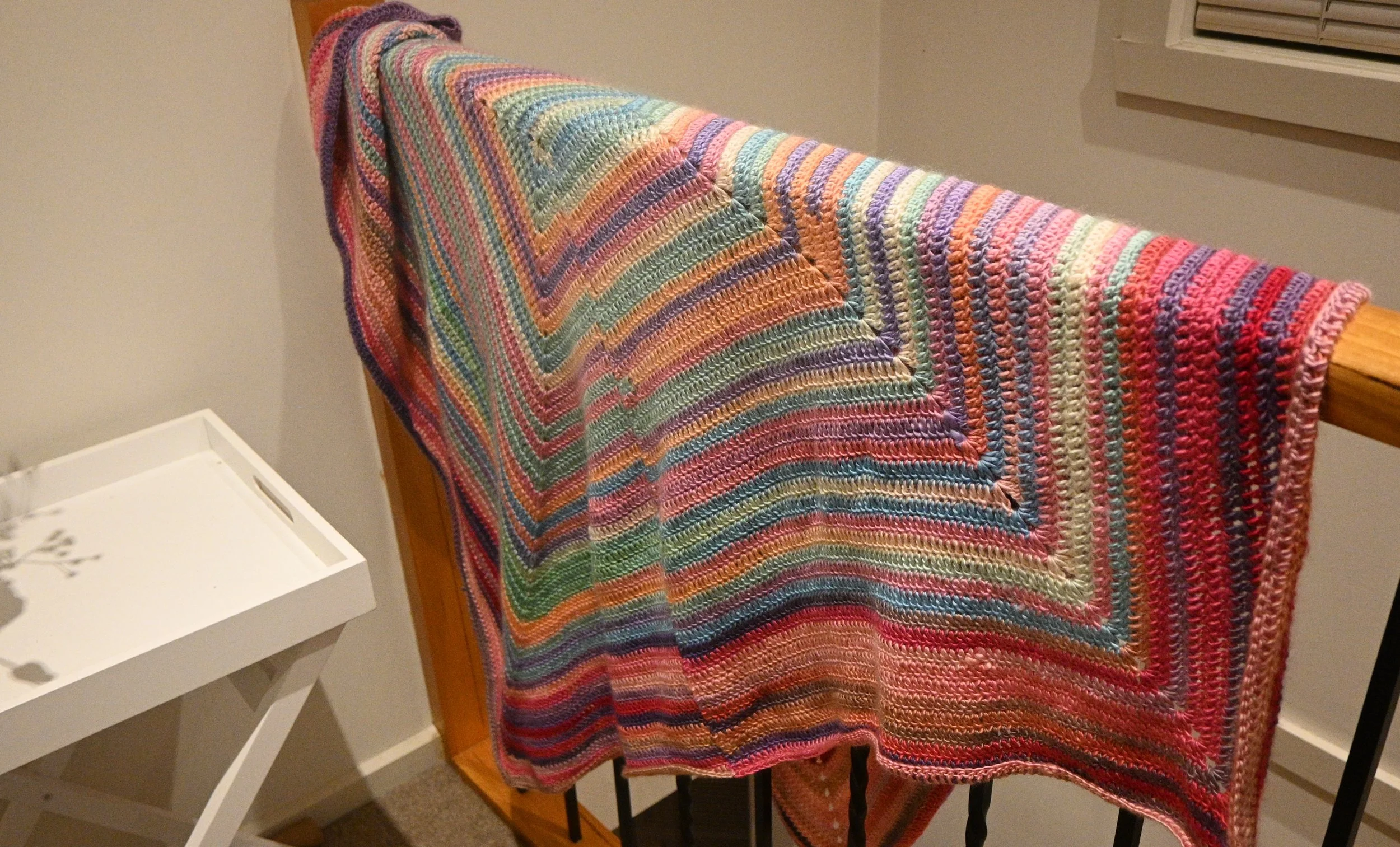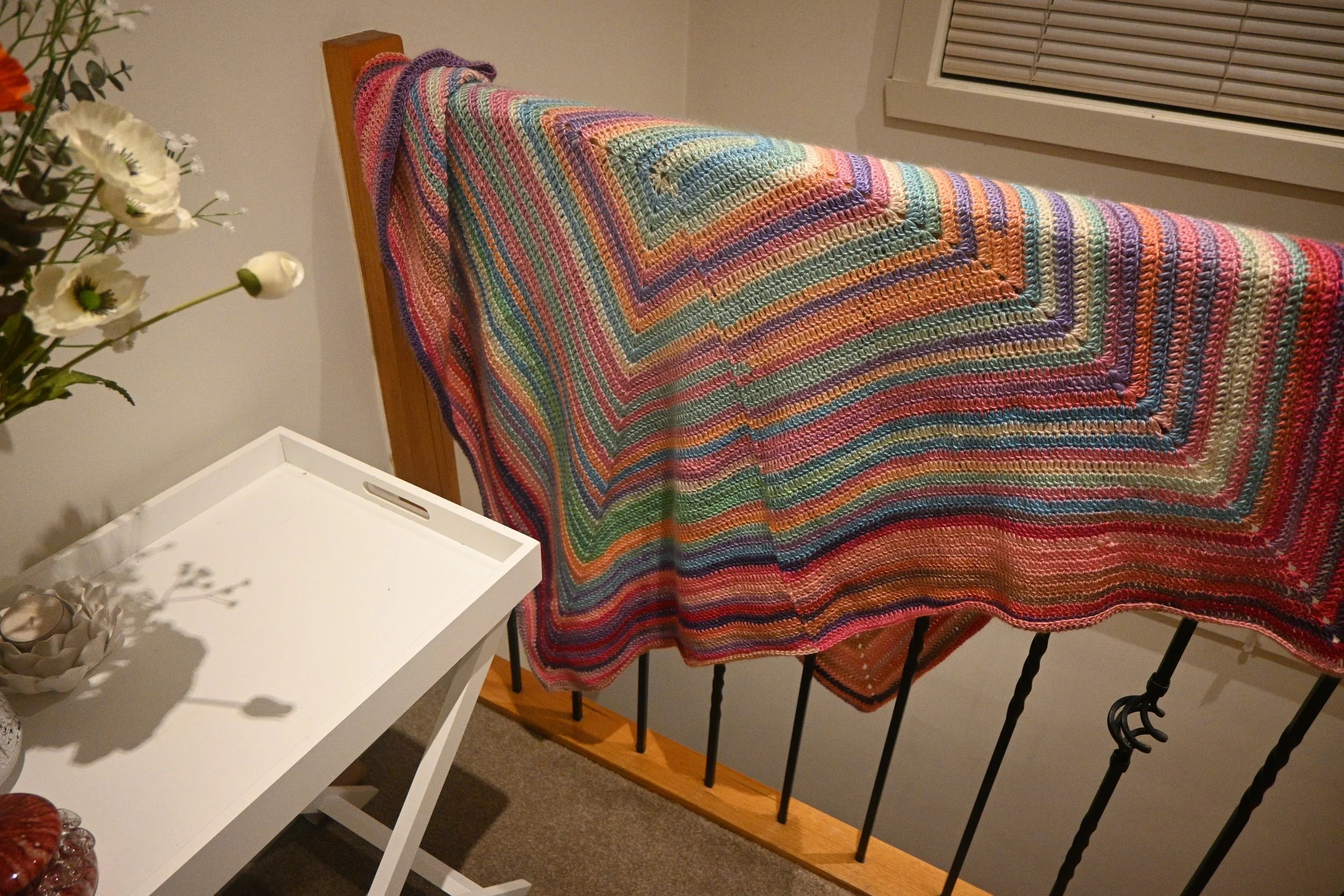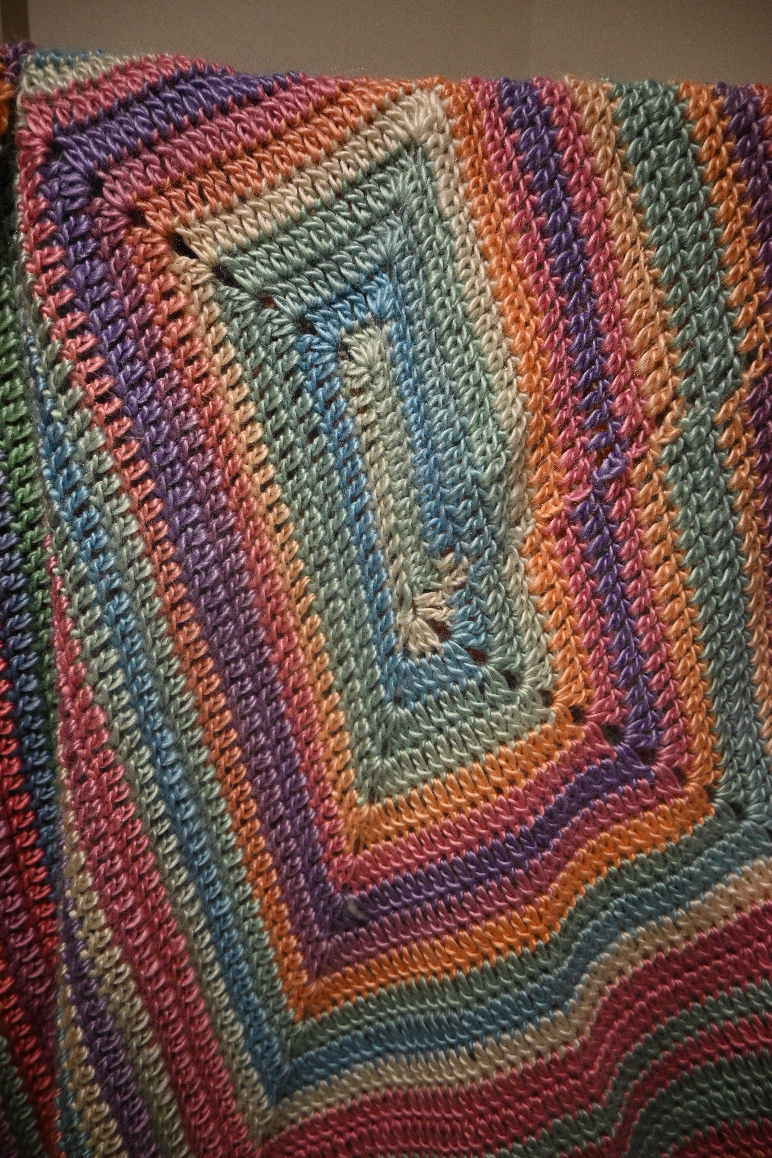 Made from acrylic cake yarn with beautiful arrangement and movement of colours. Simple design, light and airy and very soft to the touch. Would make a great shawl, knee blanket or baby blanket.