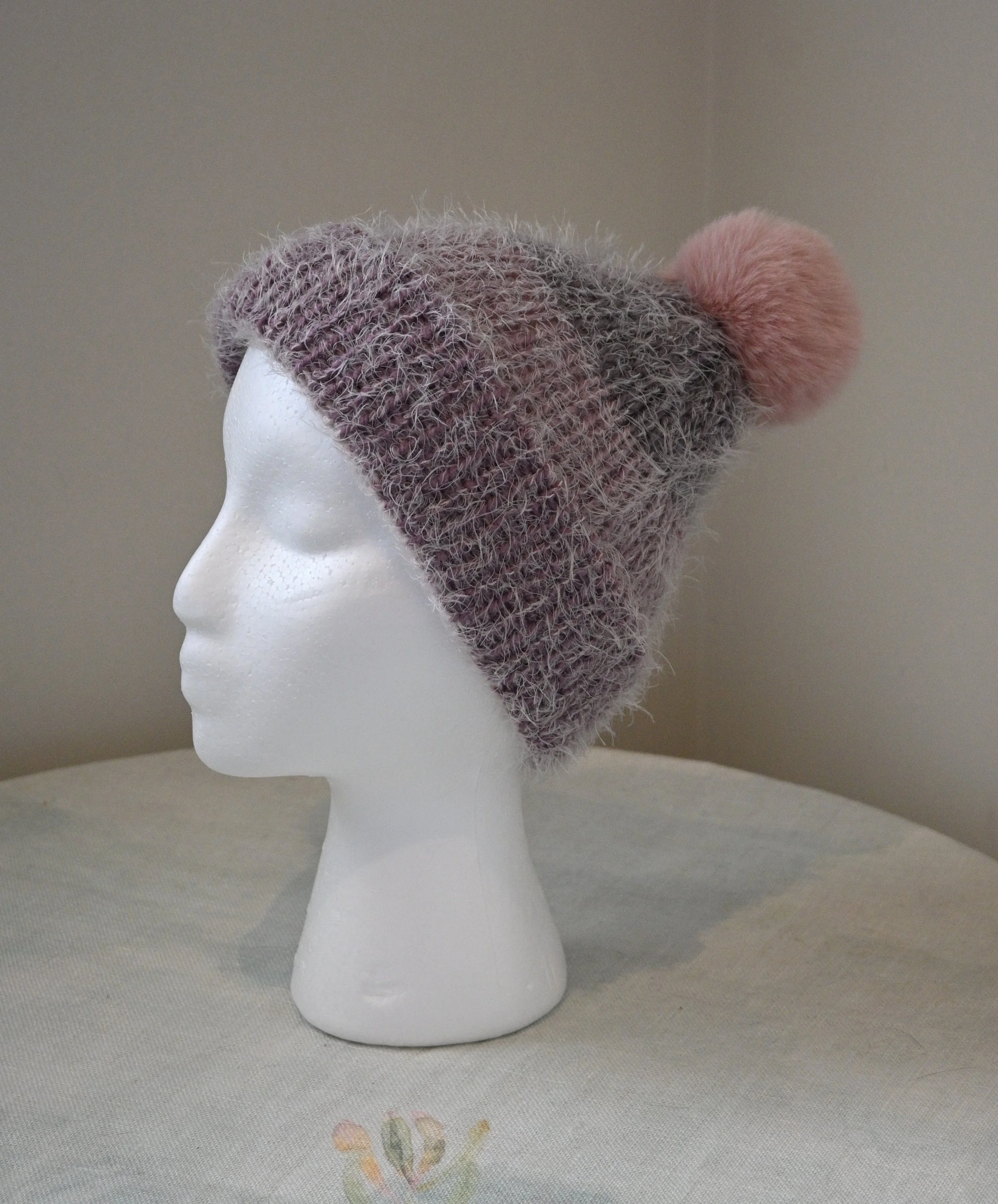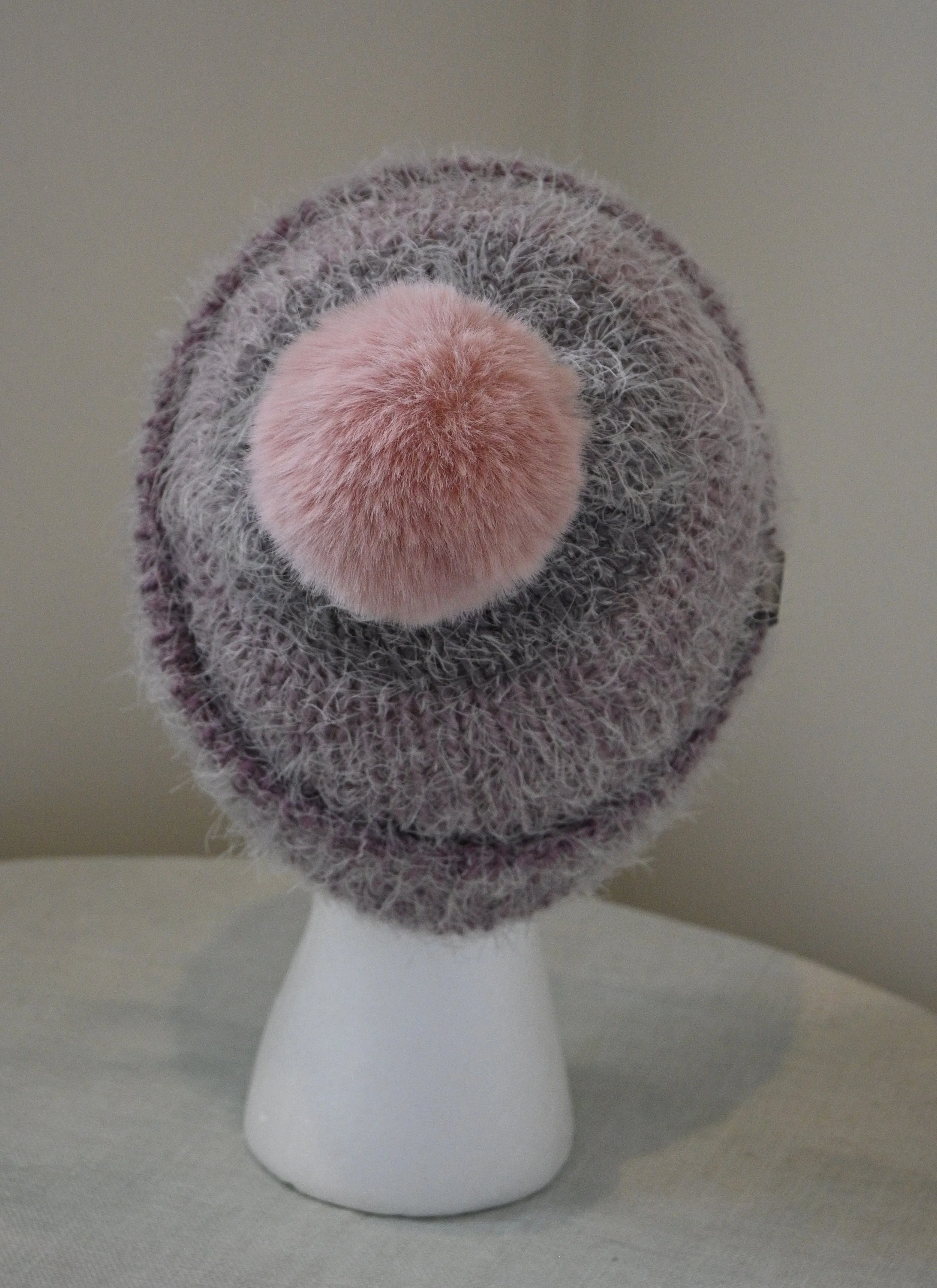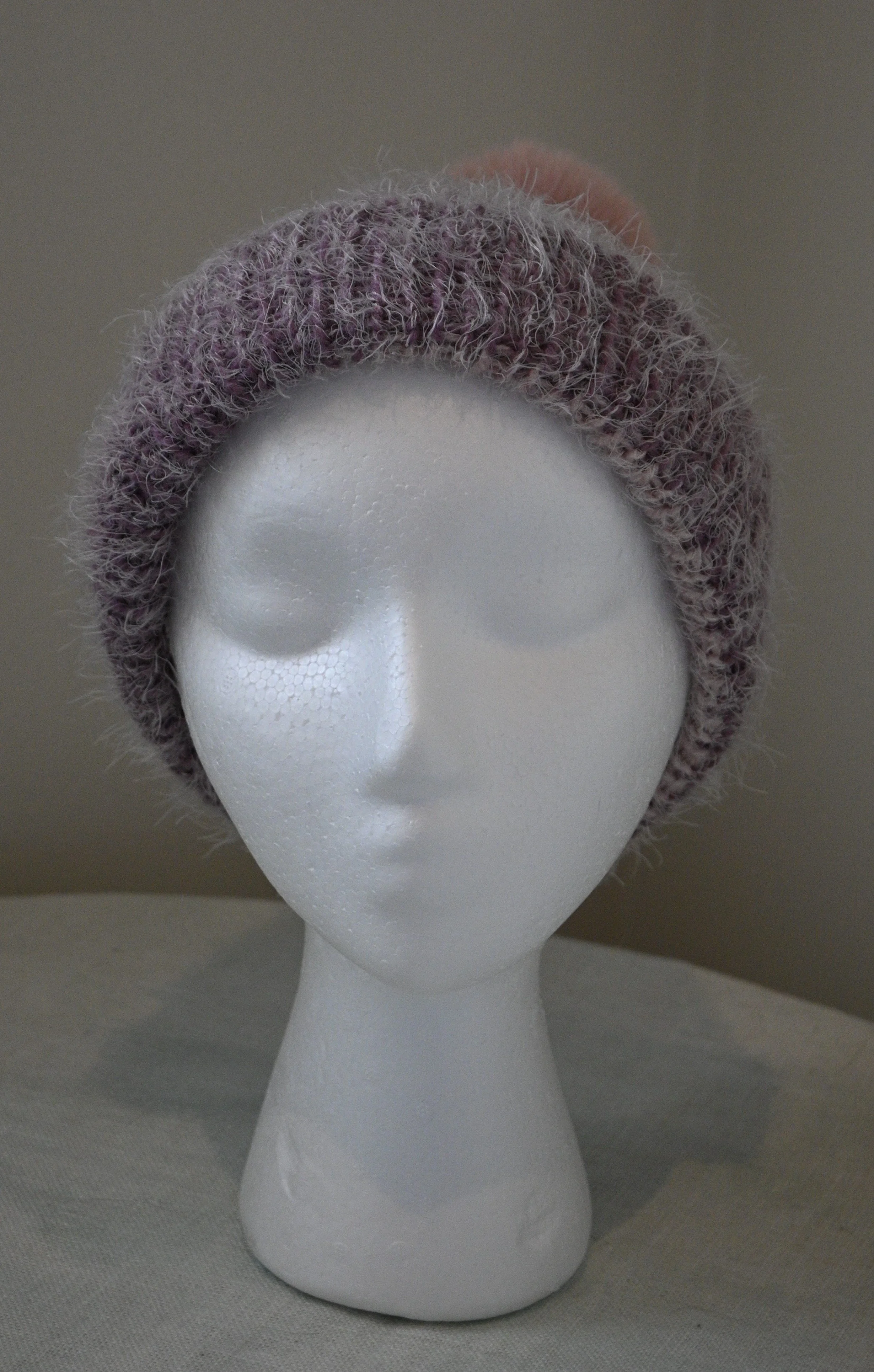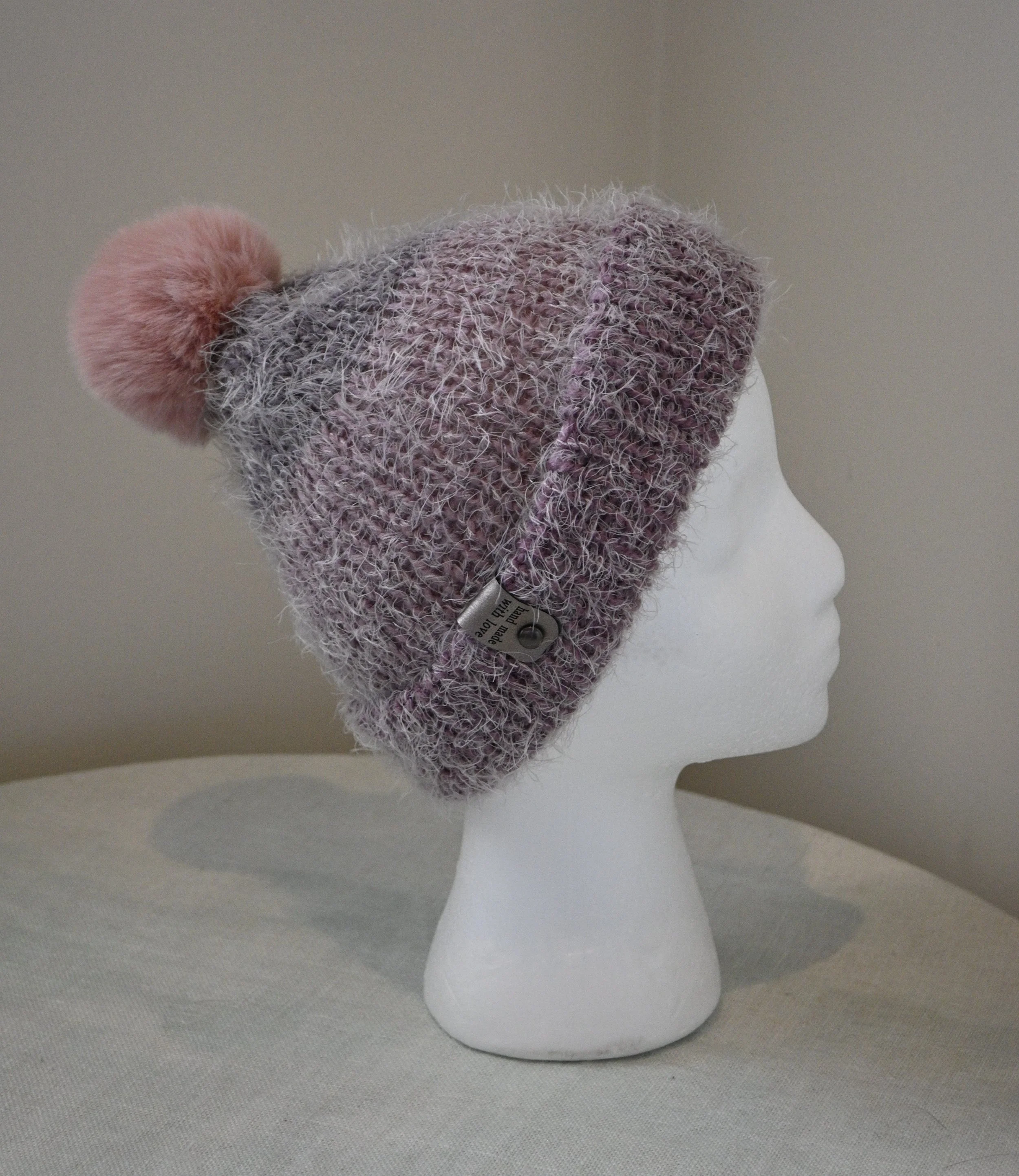 Beautiful soft squishy beanie with grades of purple from light to dark; double layered for extra warmth; rose pink bobble; snug fit with heaps of stretch and soft on the face