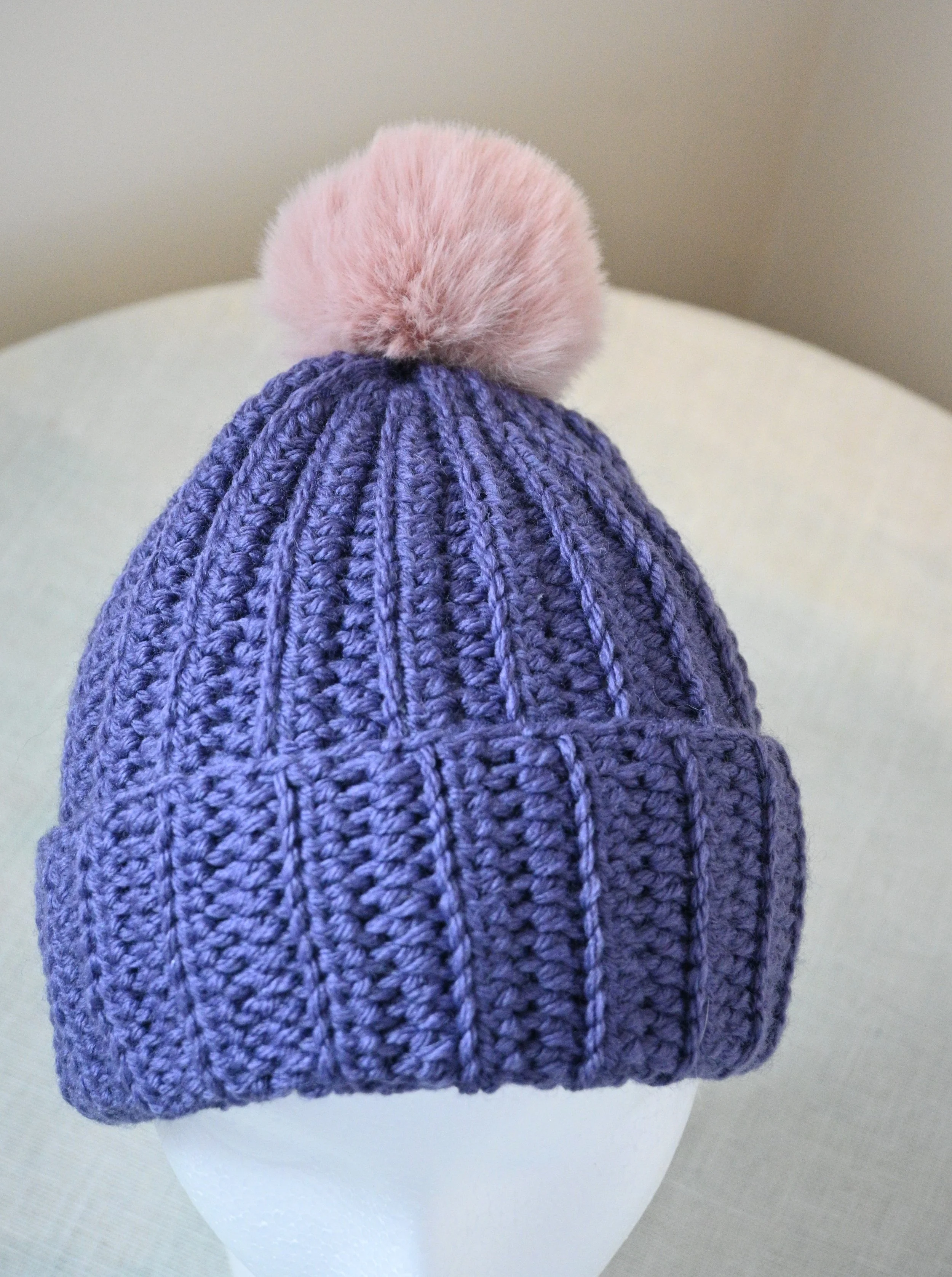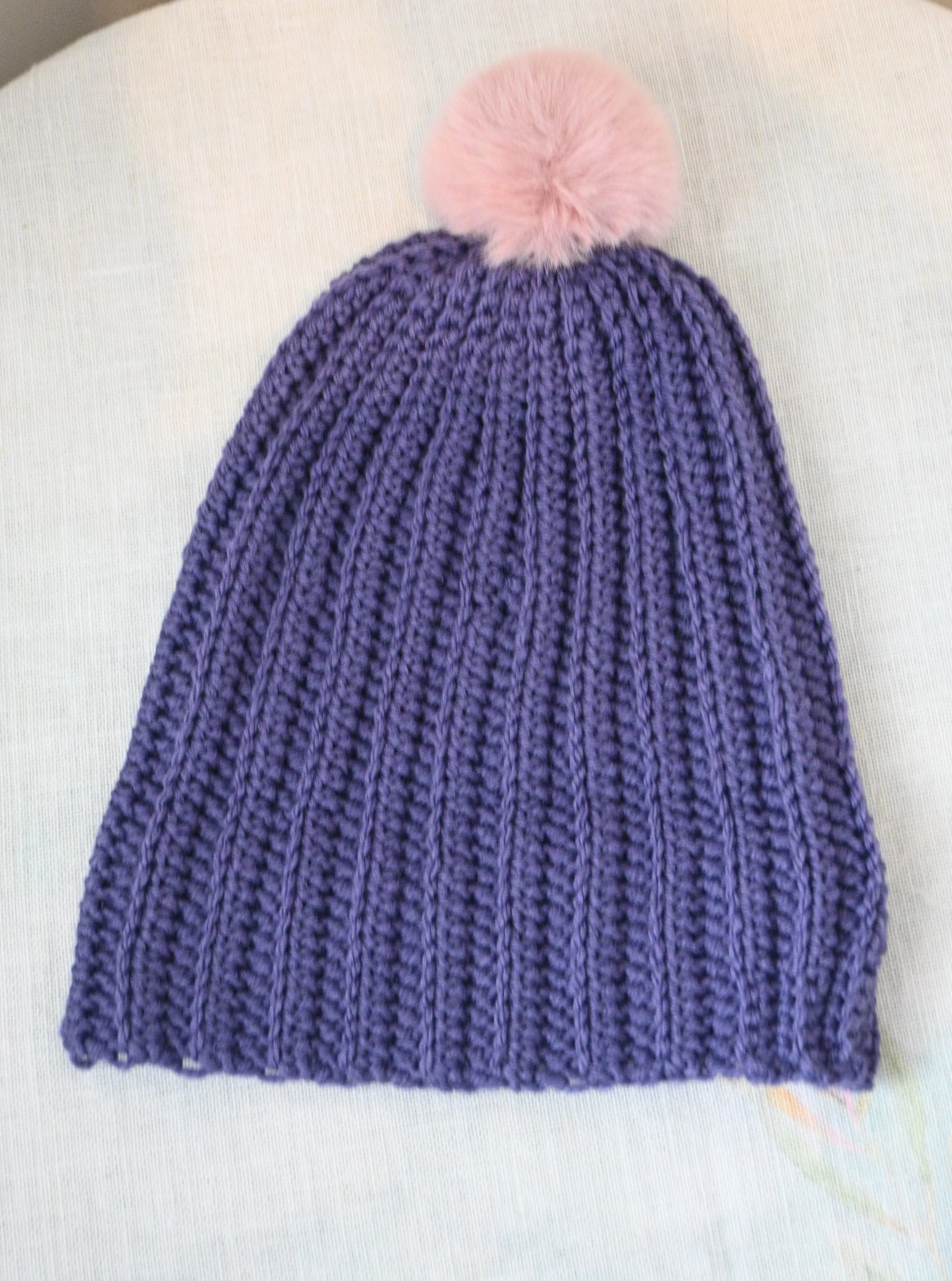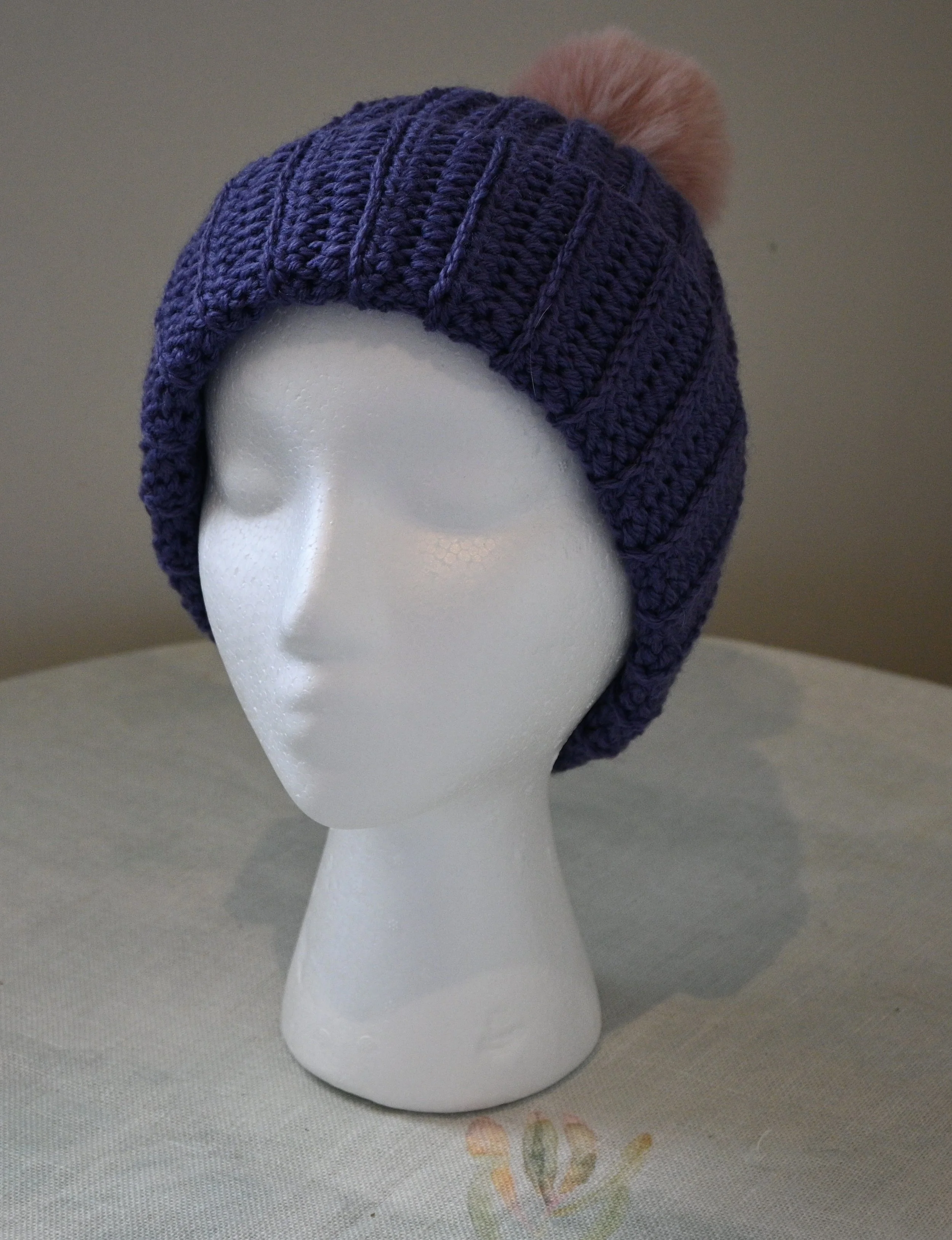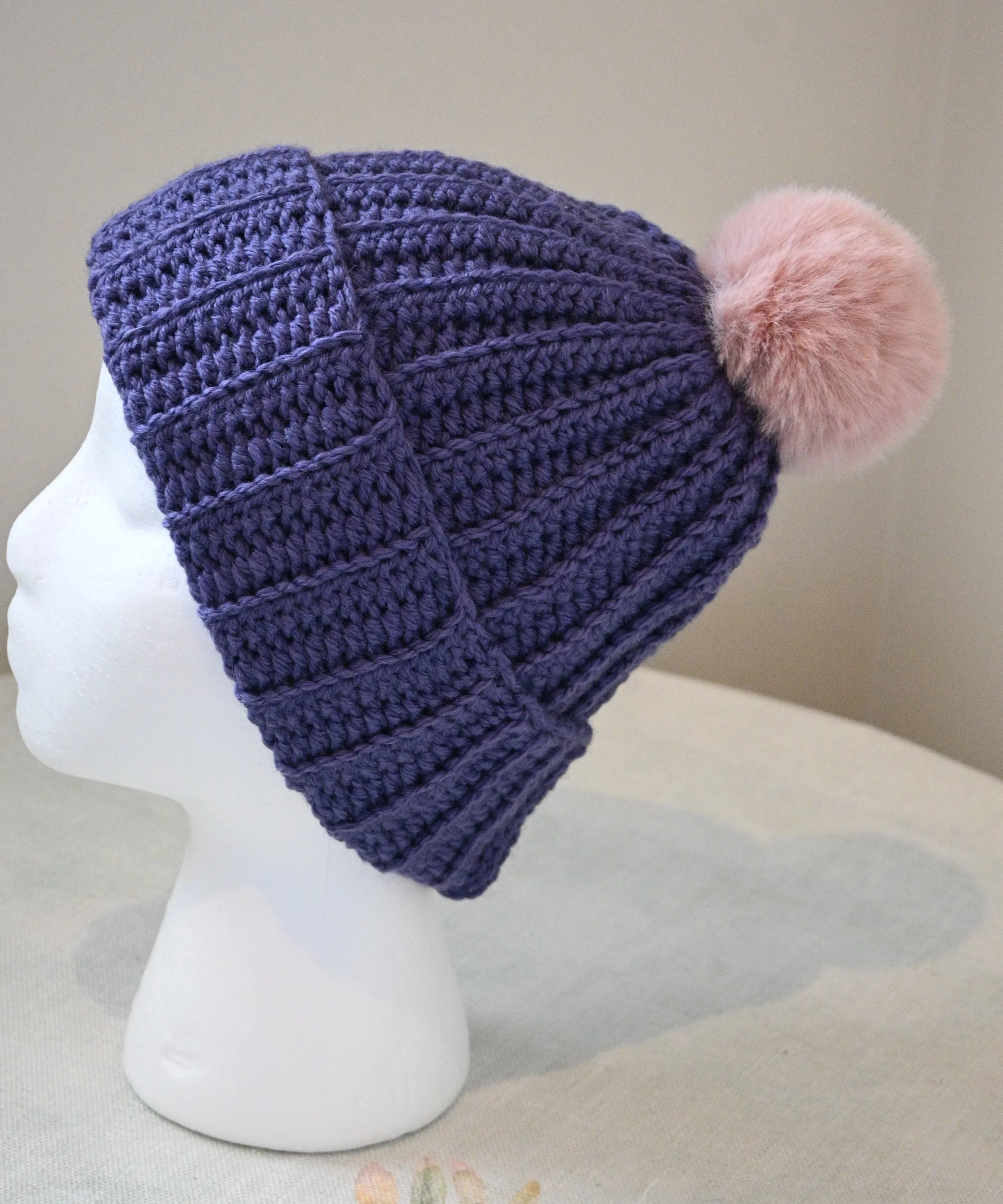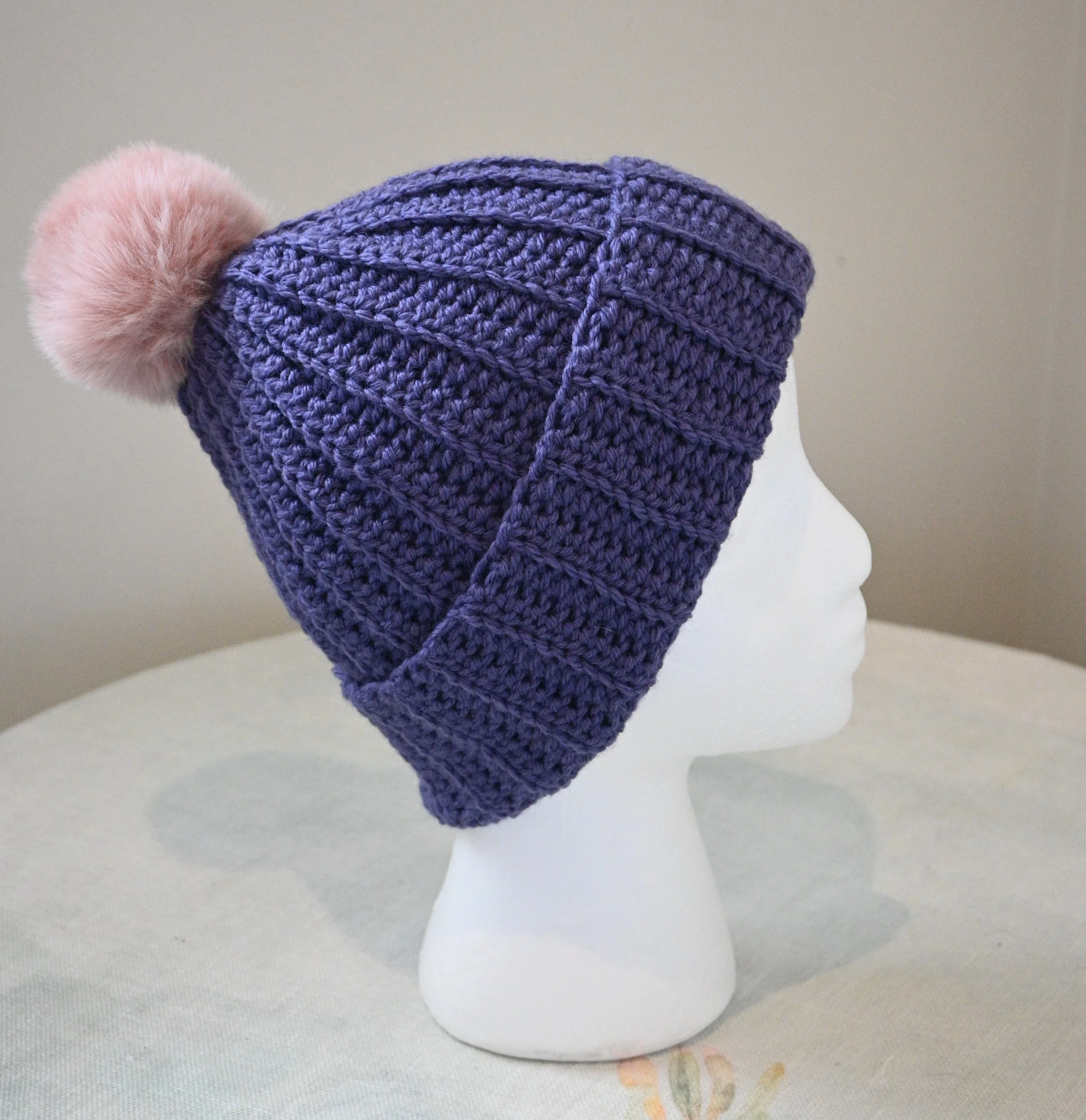 Crochet beanie of pure wool; beautiful deep purple coloring with dusty pink bobble