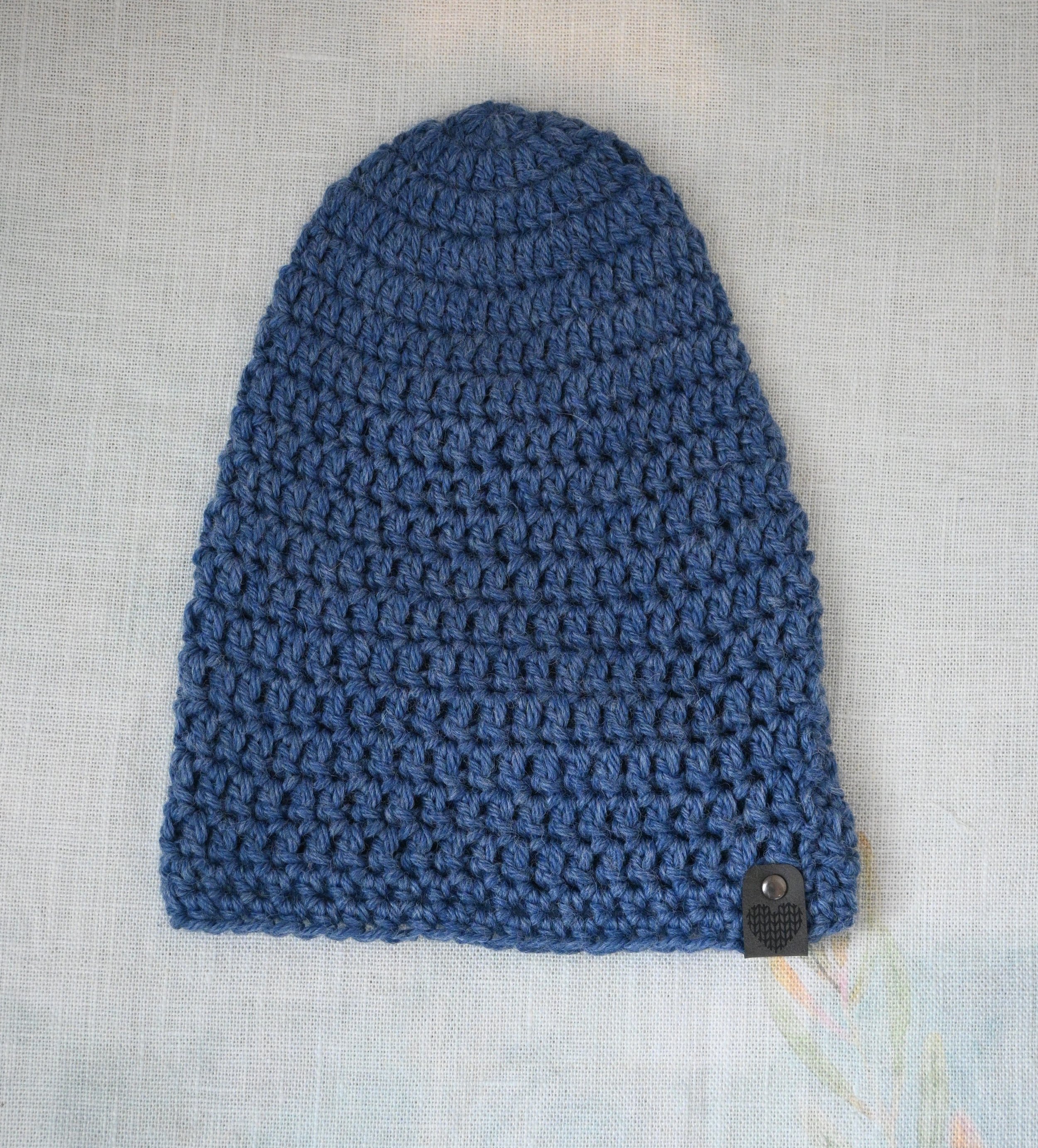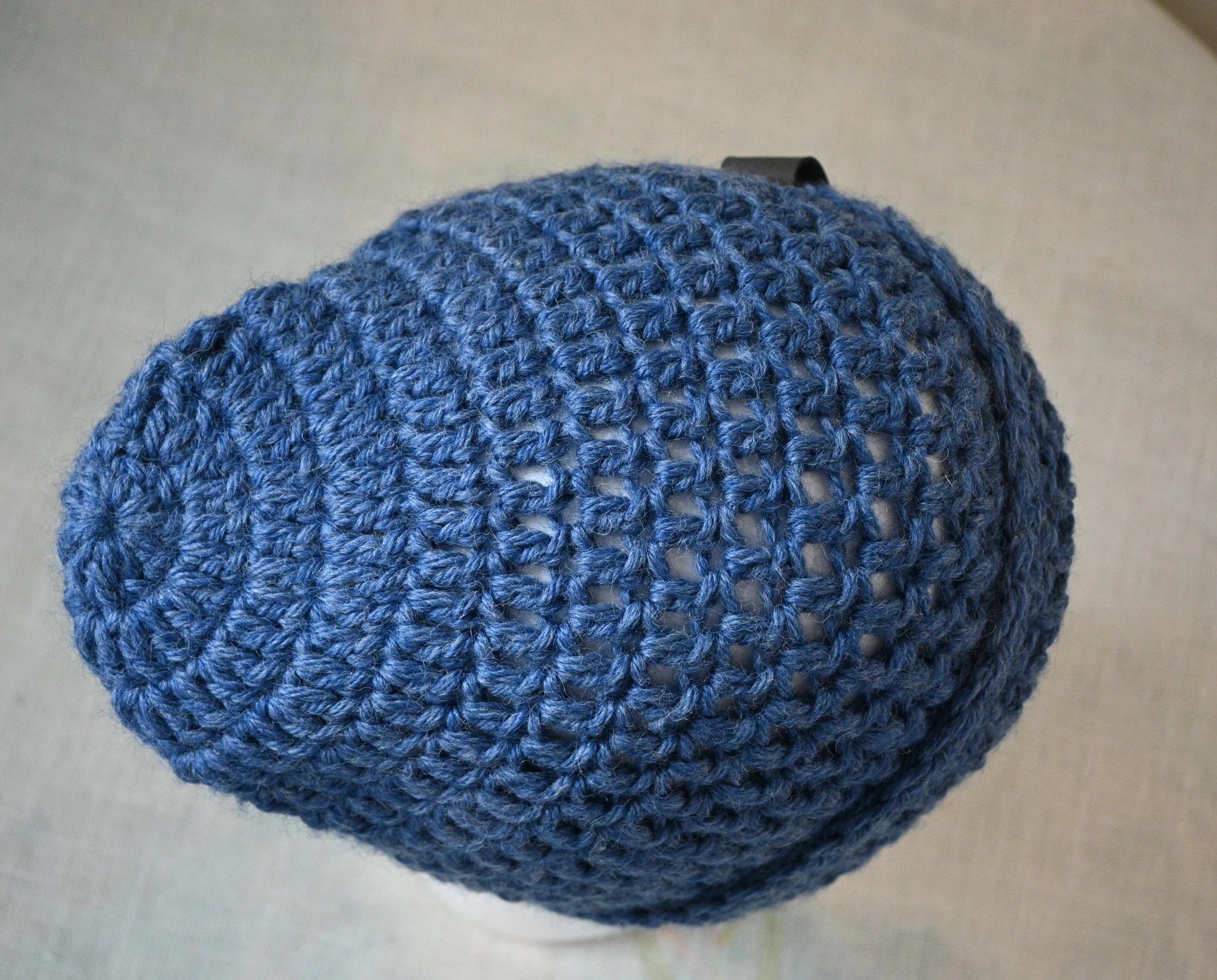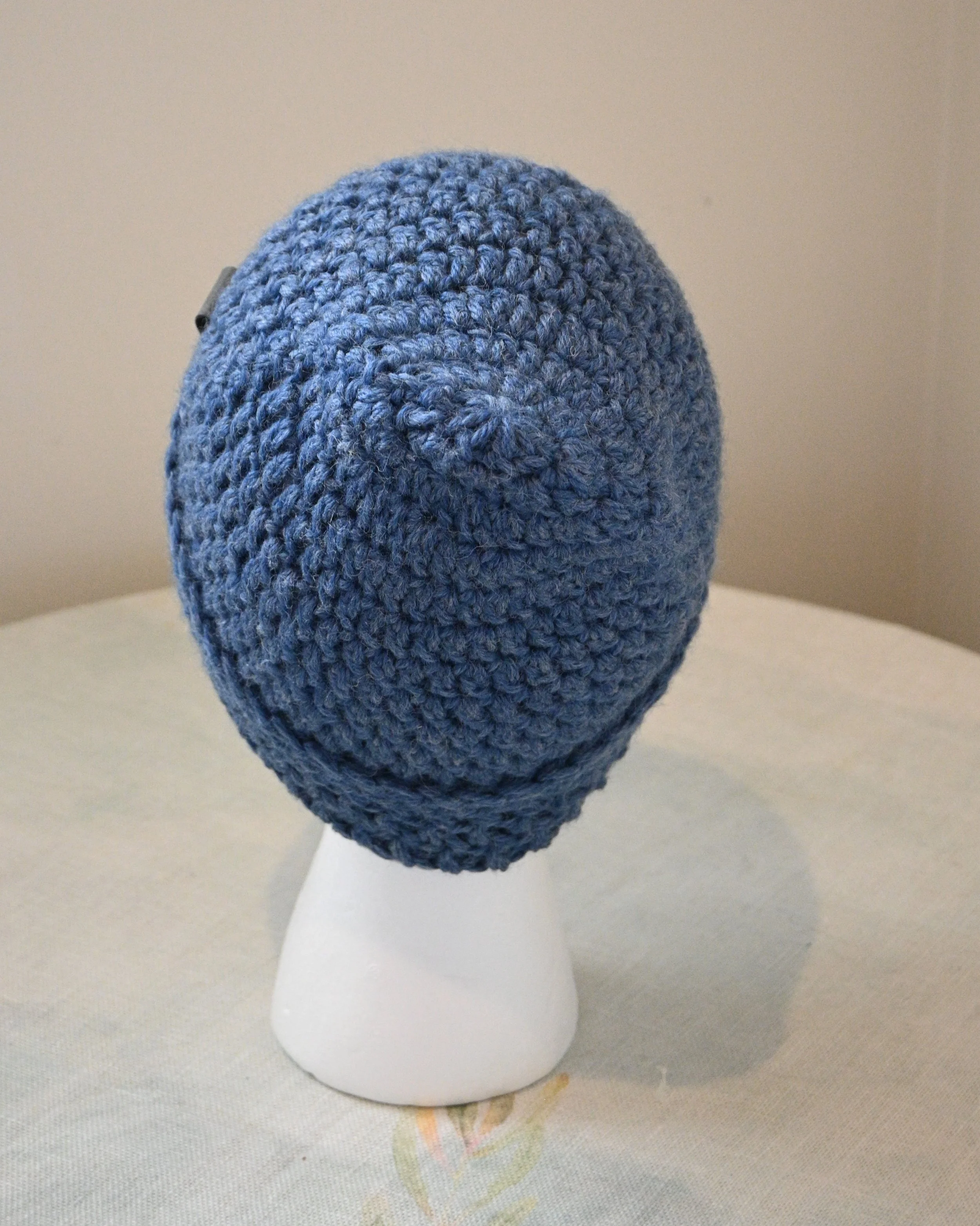 Crochet beanie of wool blend; medium size of dark blue; snug fit