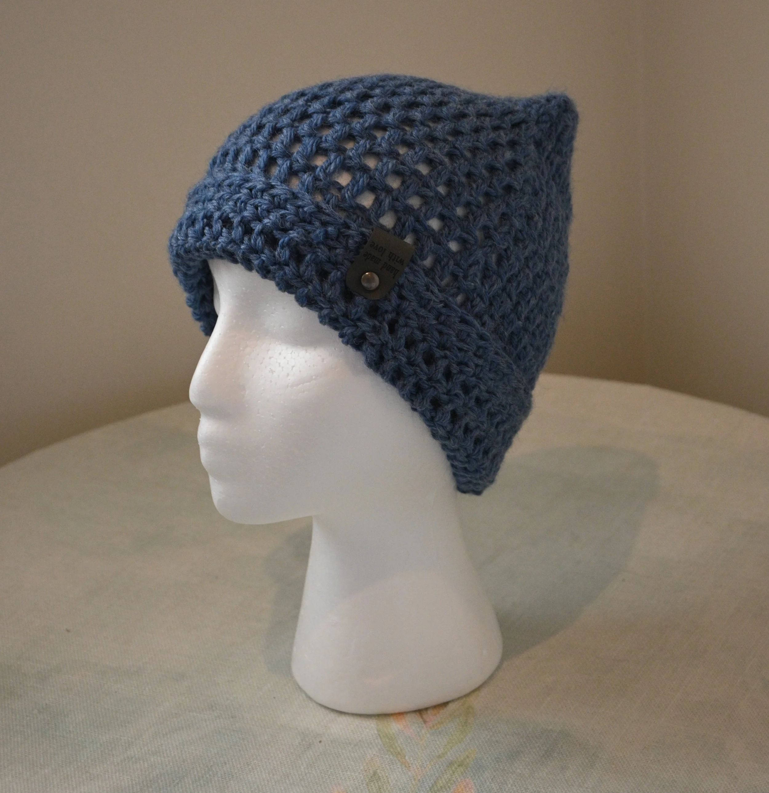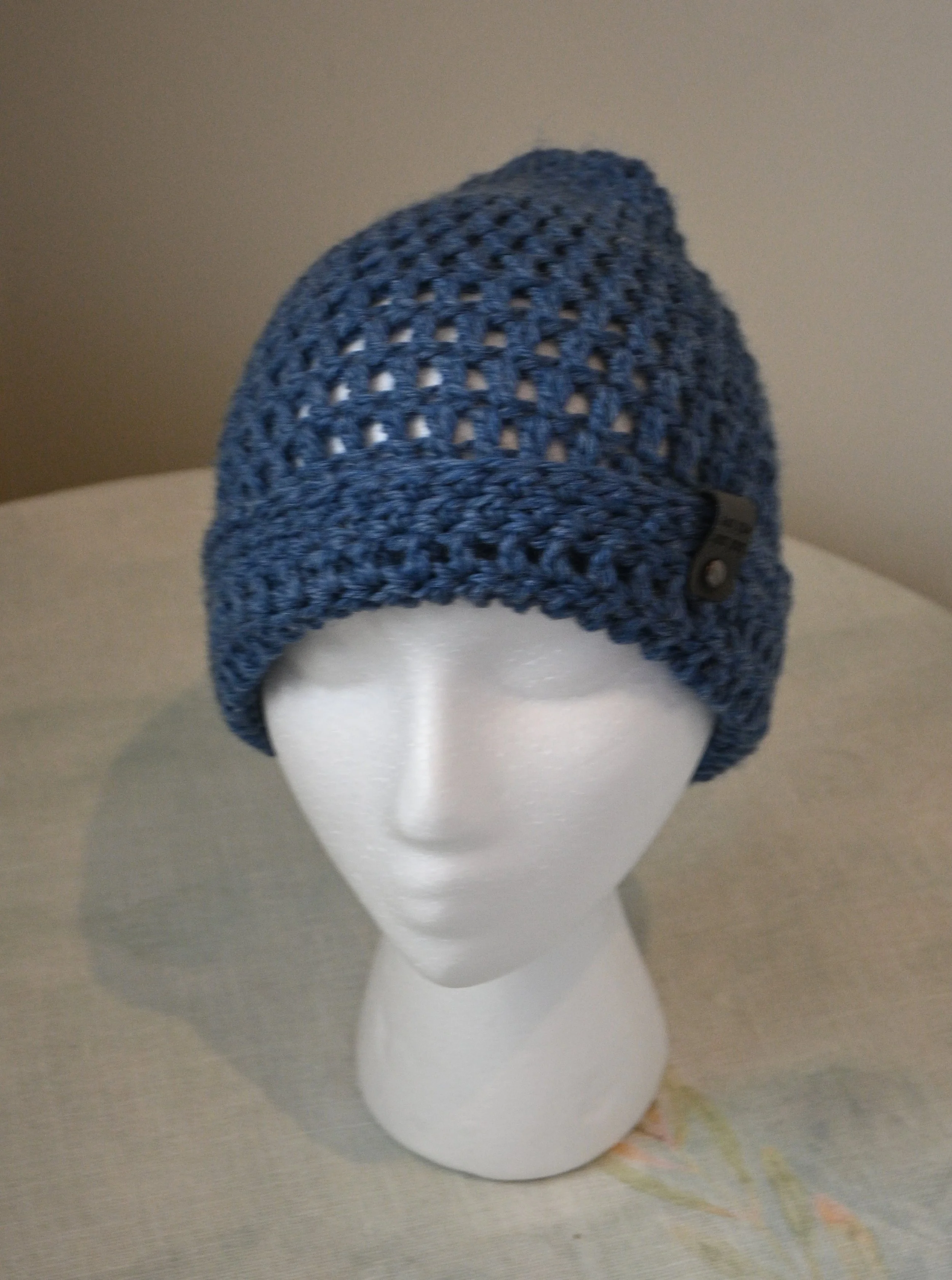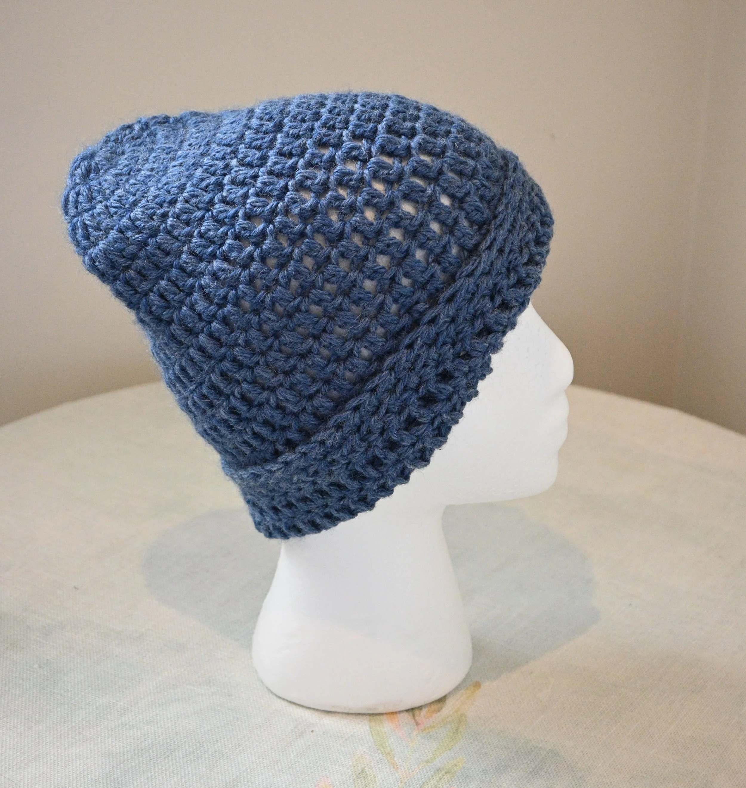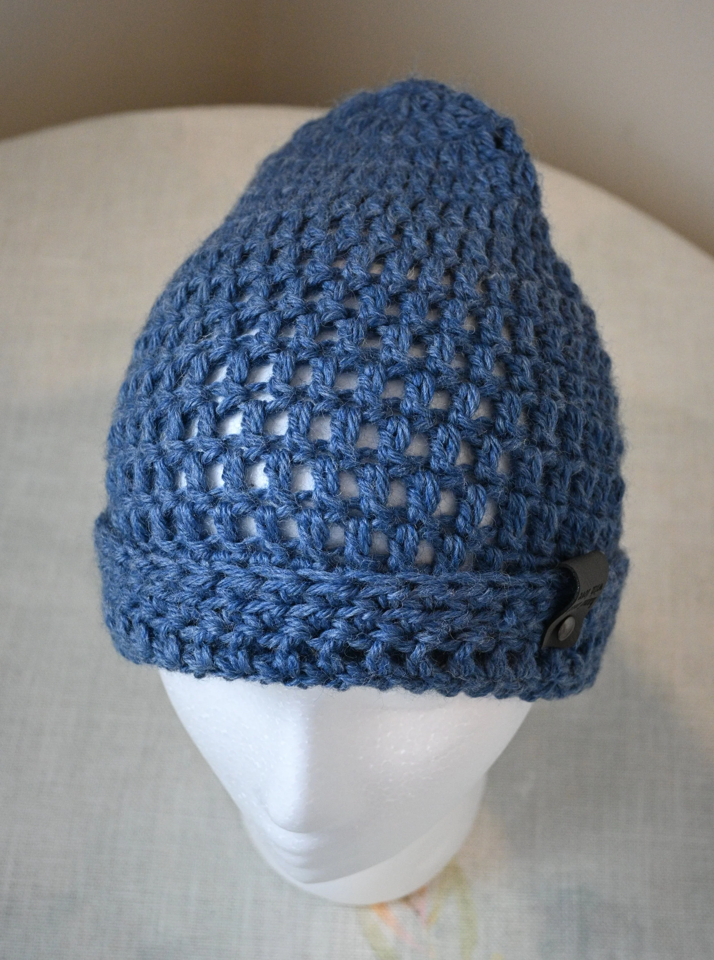 Crochet beanie of wool blend; medium size of dark blue; snug fit