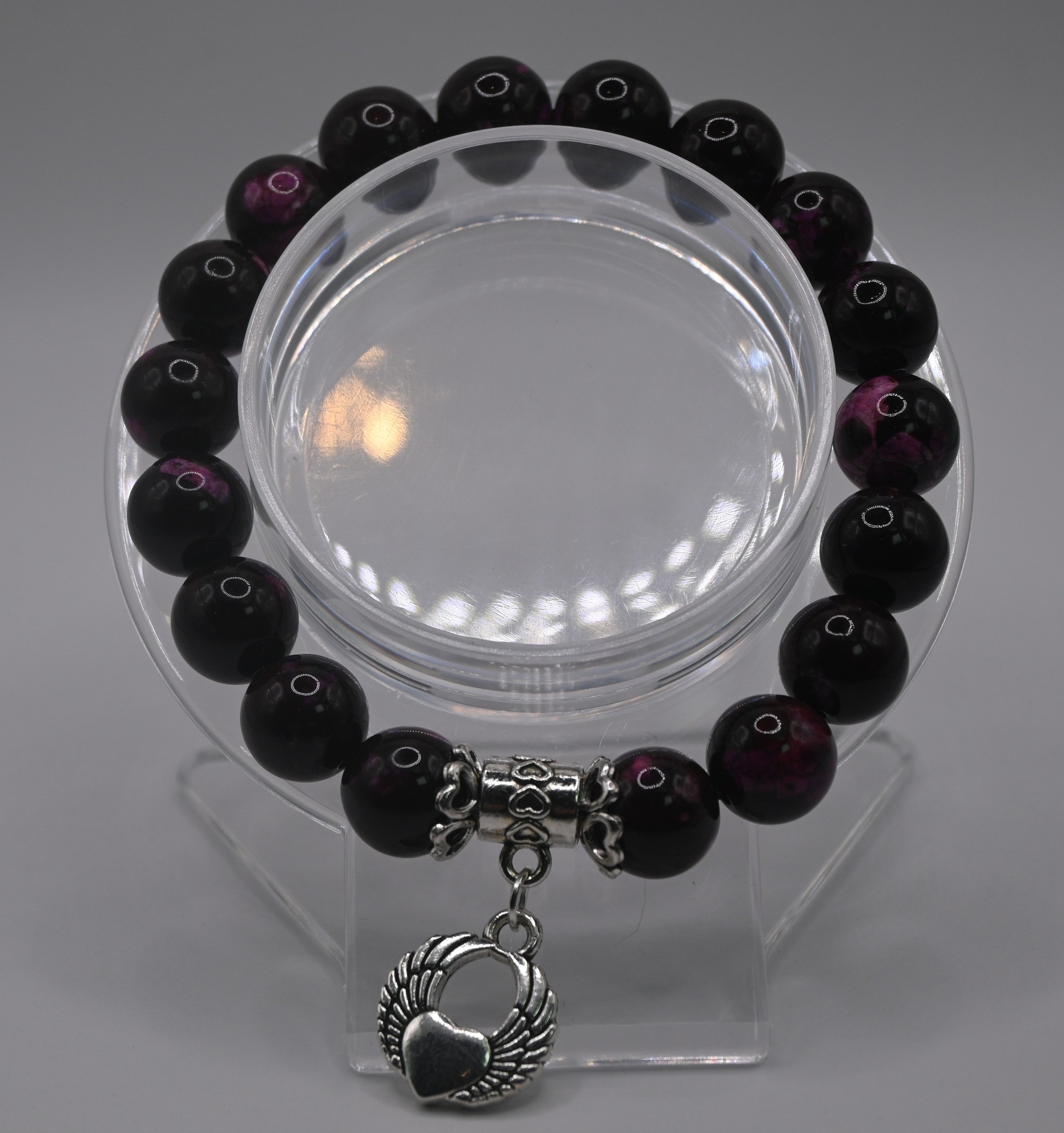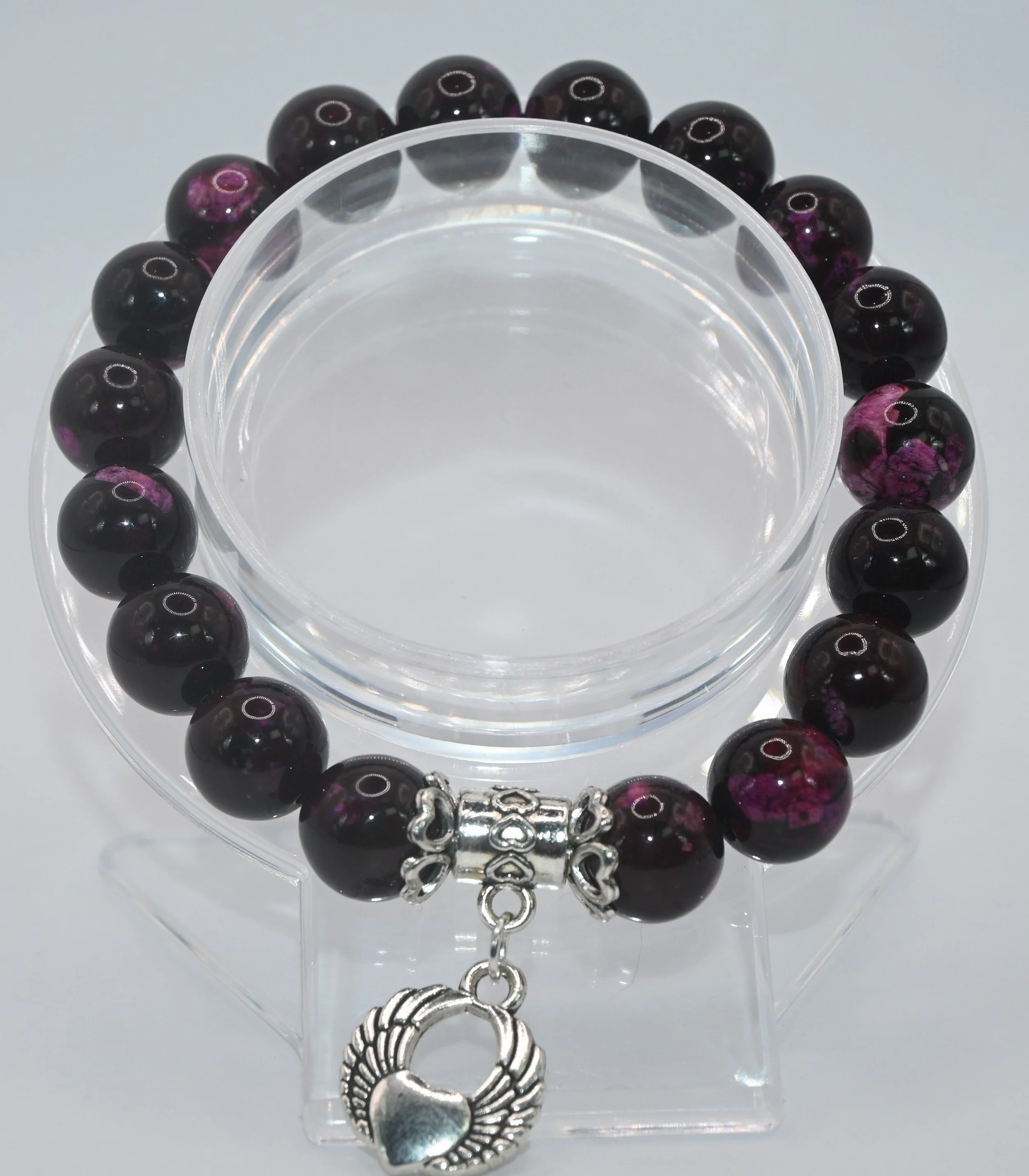 Elastic stretch bracelet with deep red natural stone beads with specialised pendant with silver fixtures