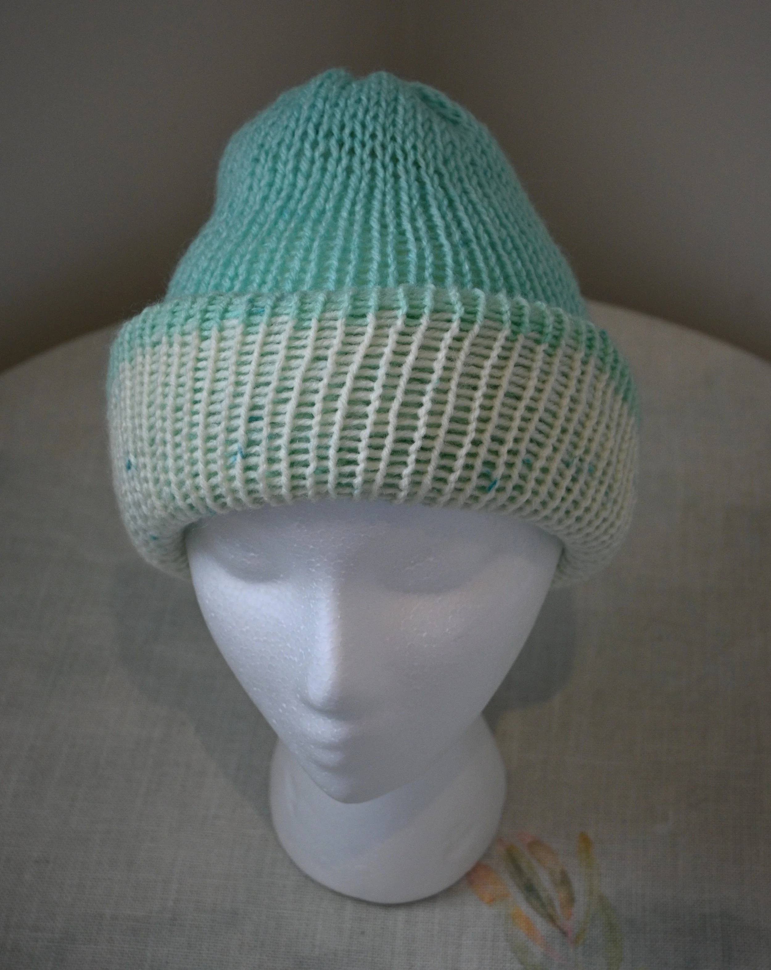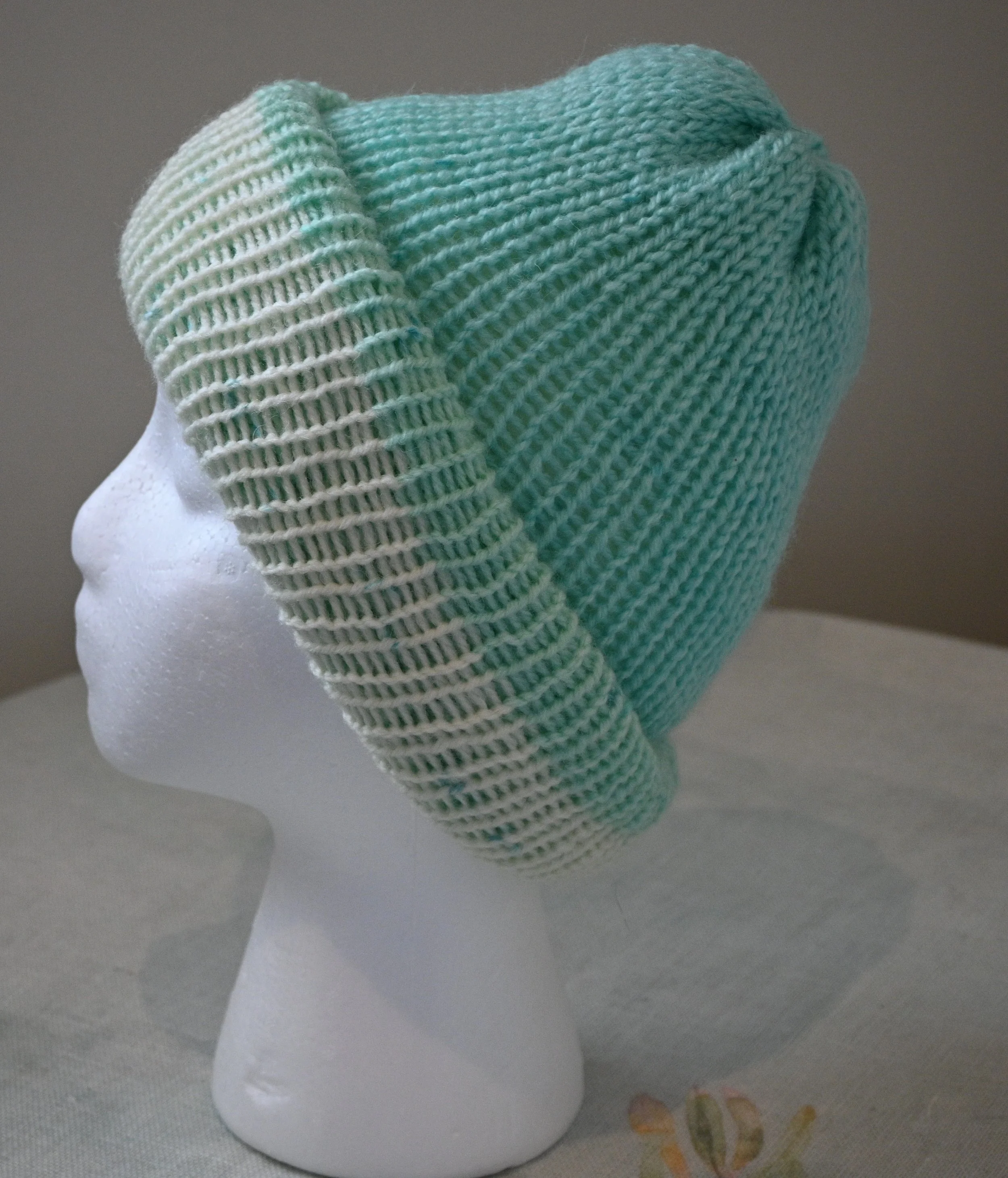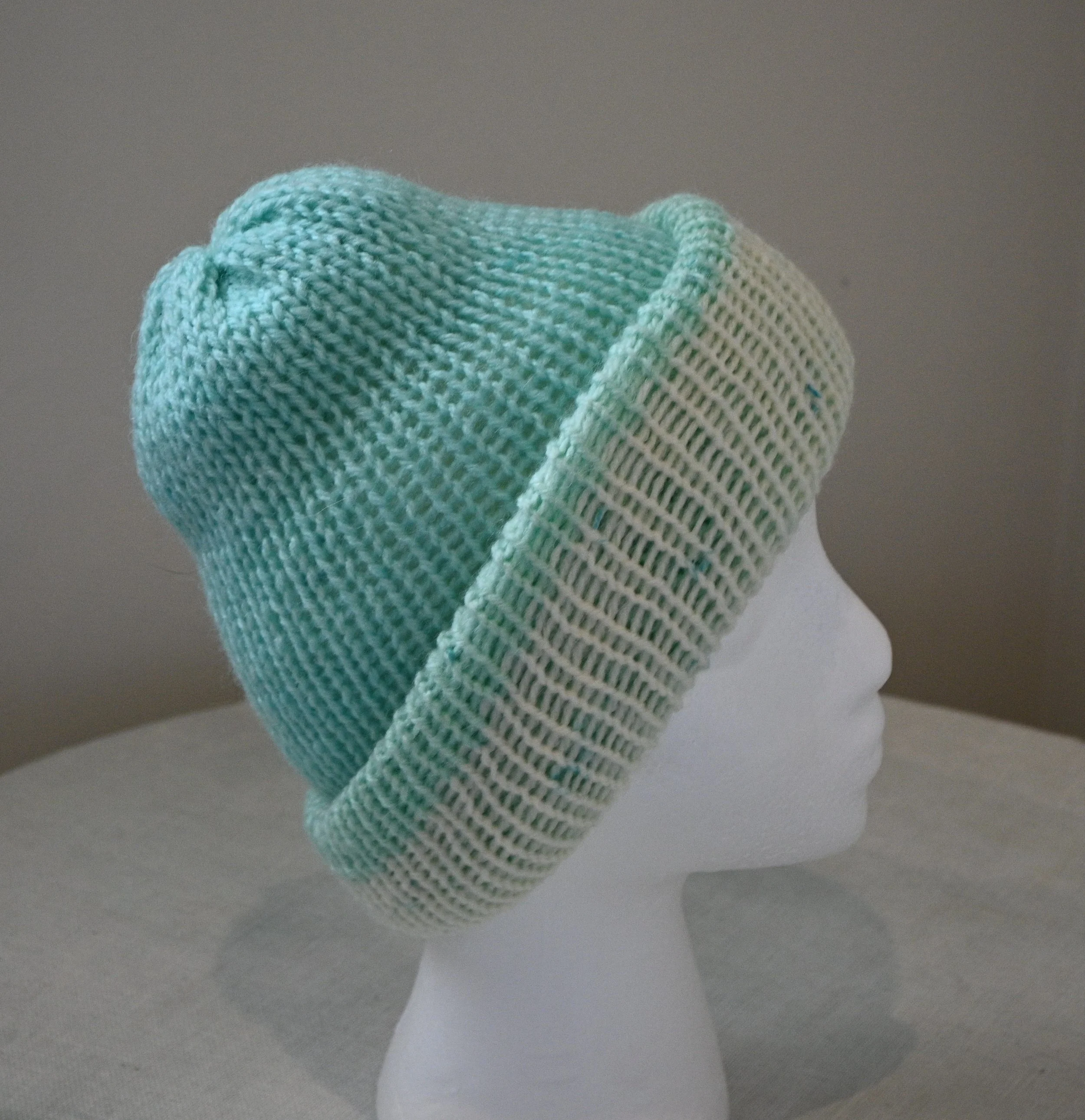 Double sided thick beanie with grades of mint green and cream; can be worn reversible; large brim which can be doubled over for extra warmth; overall size is on the large size so extra warm for your ears