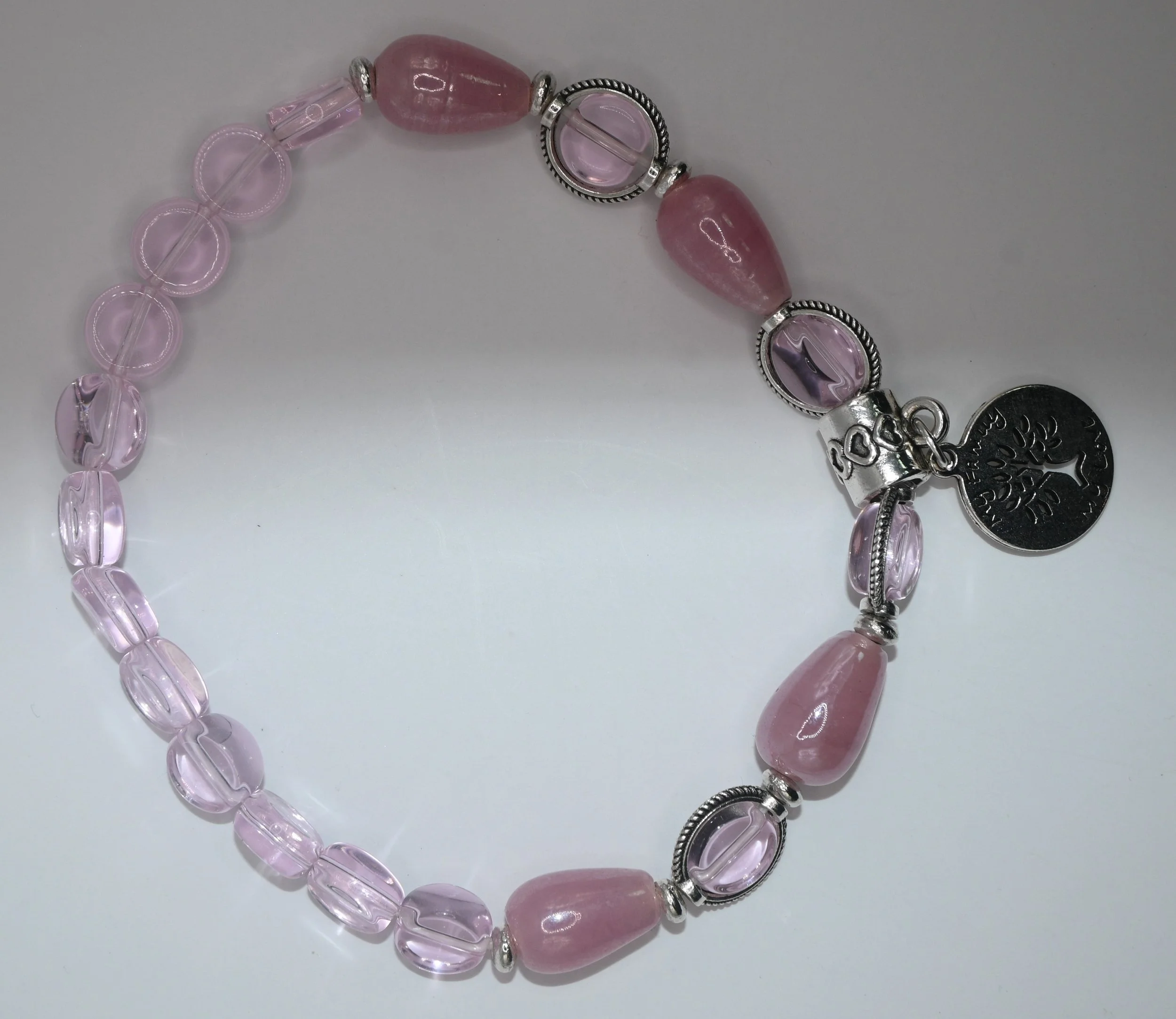 Elastic stretch bracelet with pearl and clear pink acrylic and glass beads with silver spacers with specialized tree of life pendant and silver fixtures